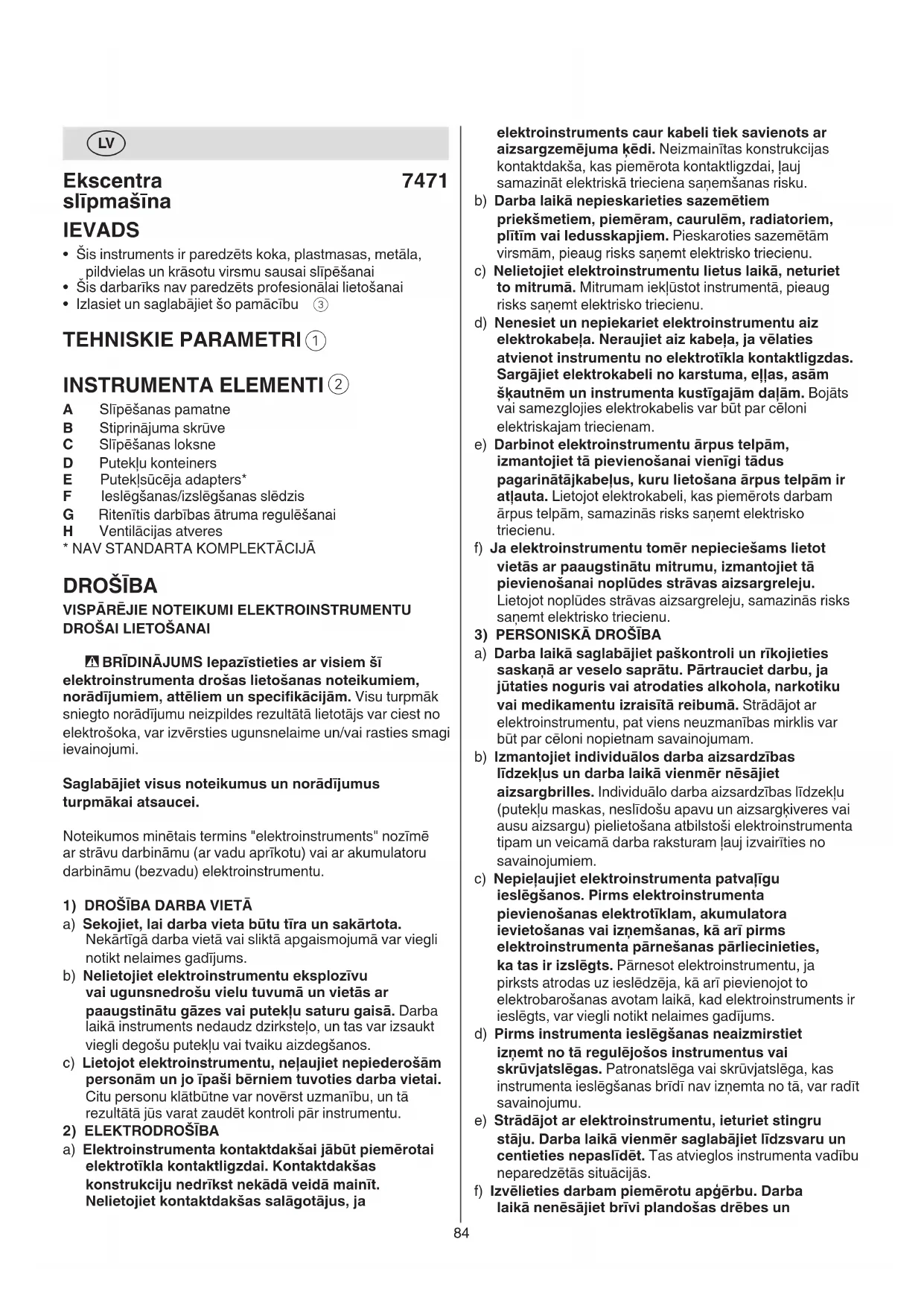 - Lihvimine - lihvimisjõudlus sõltub põhiliselt valitud lihvpaberist, eelnevalt valitud lihvimiskiirusest ja rakendatavast survest ! liigne surve ei anna paremat lihvimistulemust, vaid kulutab kiiremini tööriista ja lihvpaberit ! ärge kunagi töödelge ühe ja sama lihvpaberiga puitu ja metalli84 elektroinstruments caur kabeli tiek savienots ar aizsargzemējuma ķēdi. Neizmainītas konstrukcijas kontaktdakša, kas piemērota kontaktligzdai, ļauj samazināt elektriskā trieciena saņemšanas risku. b) Darba laikā nepieskarieties sazemētiem priekšmetiem, piemēram, caurulēm, radiatoriem, plītīm vai ledusskapjiem. Pieskaroties sazemētām virsmām, pieaug risks saņemt elektrisko triecienu. c) Nelietojiet elektroinstrumentu lietus laikā, neturiet to mitrumā. Mitrumam iekļūstot instrumentā, pieaug risks saņemt elektrisko triecienu. d) Nenesiet un nepiekariet elektroinstrumentu aiz elektrokabeļa. Neraujiet aiz kabeļa, ja vēlaties atvienot instrumentu no elektrotīkla kontaktligzdas. Sargājiet elektrokabeli no karstuma, eļļas, asām šķautnēm un instrumenta kustīgajām daļām. Bojāts vai samezglojies elektrokabelis var būt par cēloni elektriskajam triecienam. e) Darbinot elektroinstrumentu ārpus telpām, izmantojiet tā pievienošanai vienīgi tādus pagarinātājkabeļus, kuru lietošana ārpus telpām ir atļauta. Lietojot elektrokabeli, kas piemērots darbam ārpus telpām, samazinās risks saņemt elektrisko triecienu. f) Ja elektroinstrumentu tomēr nepieciešams lietot vietās ar paaugstinātu mitrumu, izmantojiet tā pievienošanai noplūdes strāvas aizsargreleju. Lietojot noplūdes strāvas aizsargreleju, samazinās risks saņemt elektrisko triecienu.