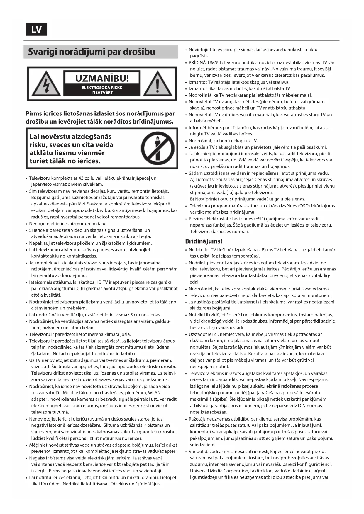 - BRĪDINĀJUMS! Televizoru nedrīkst novietot uz nestabilas virsmas. TV var nokrist, radot bīstamas traumas vai nāvi. No vairuma traumu, it sevišķi bērnu, var izvairīties, ievērojot vienkāršus piesardzības pasākumus.