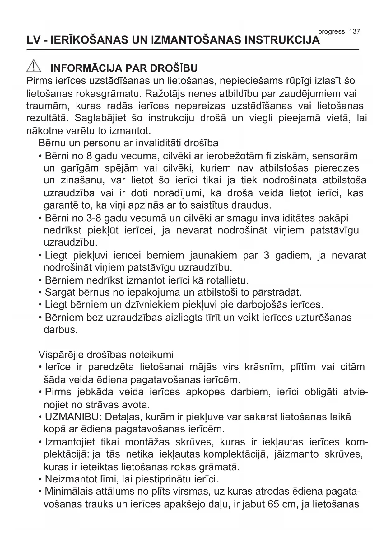 - Minimālais attālums no plīts virsmas, uz kuras atrodas ēdiena pagata- vošanas trauks un ierīces apakšējo daļu, ir jābūt 65 cm, ja lietošanas138 progress rokasgrāmatā nav noteikts savādāk. Ja plīts virsmas uzstādīšanas rokasgrāmatā ir noteikta lielāka distance, tā ir jāievēro.