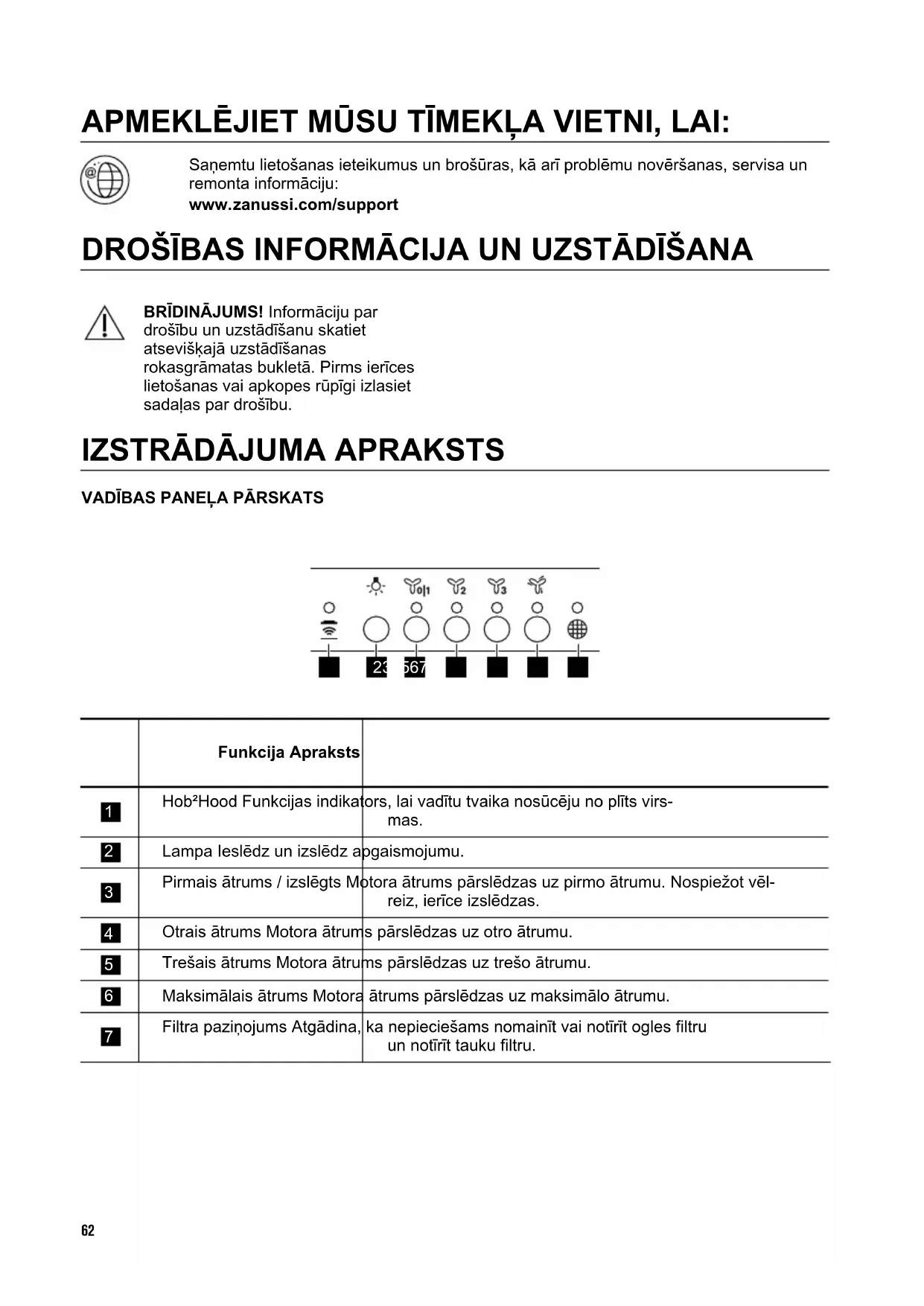 Filtra brīdinājums atgādina, ka nepieciešams nomainīt vai notīrīt ogles filtru un notīrīt tauku filtru. Tauku filtra tīrīšanas nepieciešamības gadījumā filtra indikators ieslēdzas uz 30 sekundēm. Ogles filtra nomaiņas vai iztīrīšanas nepieciešamības gadījumā filtra indikators mirgo 30 sekundes. Skatiet informāciju par tauku filtra tīrīšanu sadaļā “Kopšana un tīrīšana”. Skatiet informāciju par ogles filtra tīrīšanu vai ogles filtra nomaiņu sadaļā “Kopšana un tīrīšana”. Lai atiestatītu funkciju, turiet nospiestu taustiņu 3 sekundes. Lai aktivizētu vai deaktivizētu funkciju: