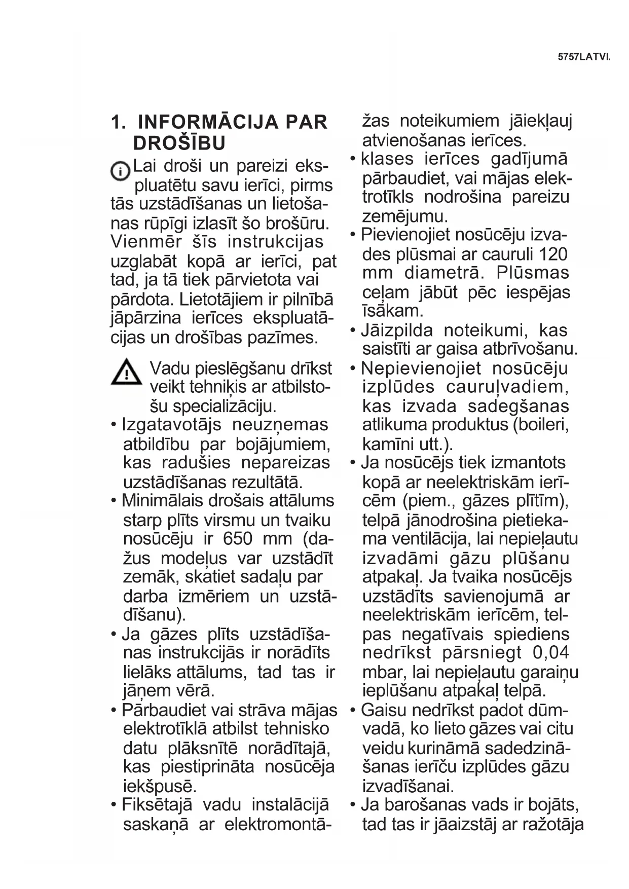 DROŠĪBU Lai droši un pareizi eks- pluatētu savu ierīci, pirms tās uzstādīšanas un lietoša- nas rūpīgi izlasīt šo brošūru. Vienmēr šīs instrukcijas uzglabāt kopā ar ierīci, pat tad, ja tā tiek pārvietota vai pārdota. Lietotājiem ir pilnībā jāpārzina ierīces ekspluatā- cijas un drošības pazīmes. Vadu pieslēgšanu drīkst veikt tehniķis ar atbilsto- šu specializāciju.