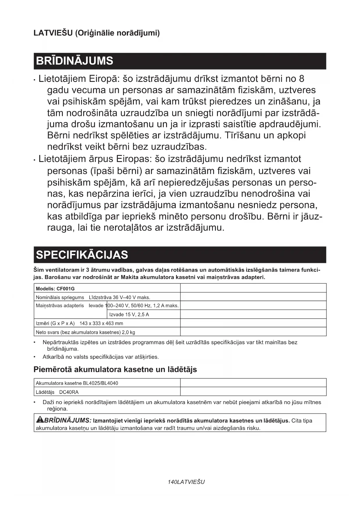 - LietotājiemārpusEiropas:šoizstrādājumunedrīkstizmantot personas(īpašibērni)arsamazinātāmziskām,uztveresvai psihiskāmspējām,kāarīnepieredzējušaspersonasunperso- nas,kasnepārzinaierīci,javienuzraudzībunenodrošinavai norādījumusparizstrādājumaizmantošanunesniedzpersona, kasatbildīgapariepriekšminētopersonudrošību.Bērniirjāuz- rauga,laitienerotaļātosarizstrādājumu. SPECIFIKĀCIJAS Šim ventilatoram ir 3 ātrumu vadības, galvas daļas rotēšanas un automātiskās izslēgšanās taimera funkci- jas. Barošanu var nodrošināt ar Makita akumulatora kasetni vai maiņstrāvas adapteri. Modelis: CF001GNominālaisspriegums Līdzstrāva36V–40Vmaks.Maiņstrāvasadapteris Ievade 100–240 V, 50/60 Hz, 1,2 A maks.Izvade 15 V, 2,5 AIzmēri(GxPxA) 143 x 333 x 463 mmNeto svars (bez akumulatora kasetnes) 2,0 kg