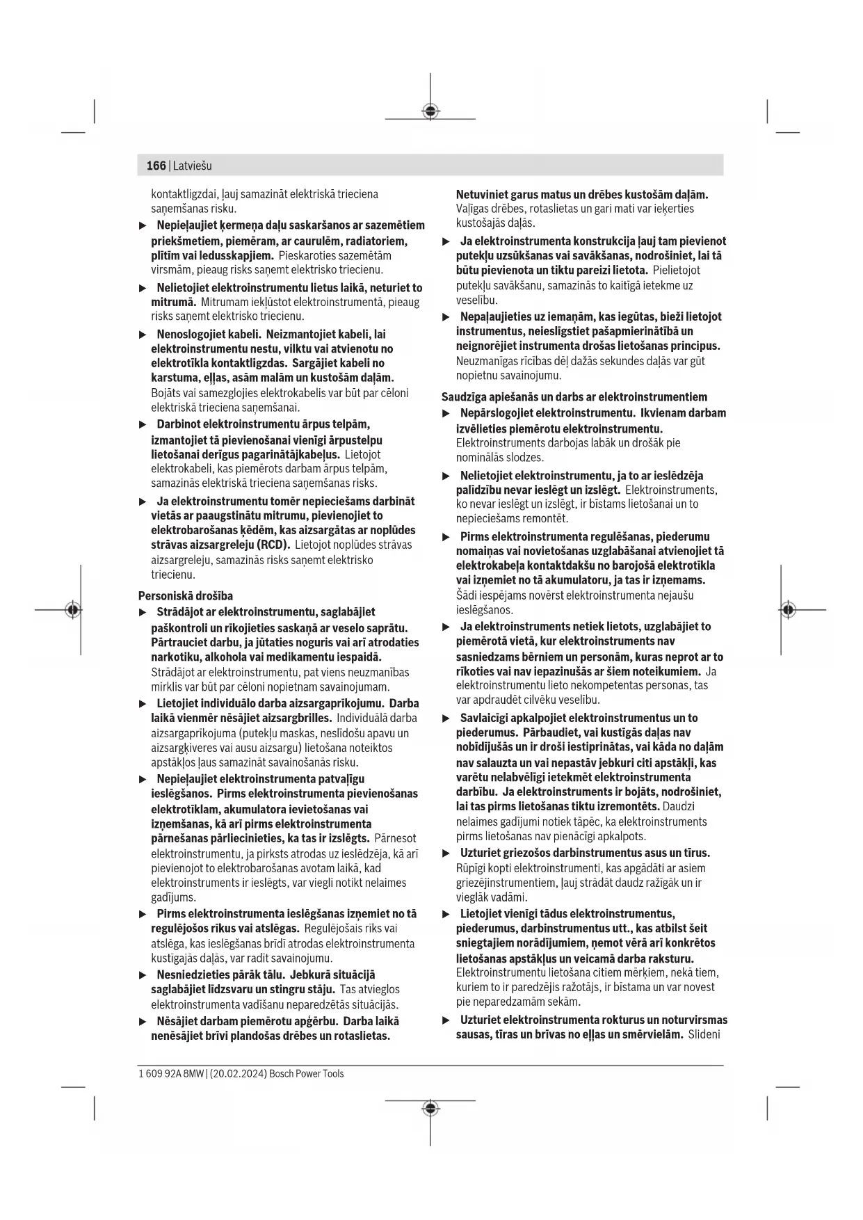 80, 120 Kruntide lõpplihvimiseks enne värviga katmist peen 180 Bosch Power Tools 1 609 92A 8MW | (20.02.2024)164 | Eesti Järeltöötluseks, nt poleerimiseks, eriti metalli ja kivi korral kasutage fliisi/poleerimisvilti. Sõltuvalt töödeldava detaili soovitud pinnakvaliteedist tuleb kasutada erinevaid fliise ja poleerimisvilte. Tolmu/saepuru äratõmme Pliisisaldusega värvide, teatud puiduliikide, mineraalide ja metalli tolm võib kahjustada tervist. Tolmuga kokkupuude ja tolmu sissehingamine võib põhjustada seadme kasutajal või läheduses viibivatel inimestel allergilisi reaktsioone ja/või hingamisteede haigusi. Teatud tolm, näiteks tamme- ja pöögitolm, on vähkitekitava toimega, iseäranis kombinatsioonis puidutöötlemisel kasutatavate lisaainetega (kromaadid, puidukaitsevahendid). Asbesti sisaldavat materjali tohivad töödelda üksnes vastava ala asjatundjad. – Kasutage konkreetse materjali eemaldamiseks sobivat tolmuimejat. – Tagage töökohas hea ventilatsioon. – Soovitav on kasutada hingamisteede kaitsemaski filtriga P2. Pidage kinni töödeldavate materjalide suhtes Teie riigis kehtivatest eeskirjadest. u Vältige tolmu kogunemist töökohta. Tolm võib kergesti süttida. Iseimemine tolmukarbiga (vt jooniseid E1–E4) Asetage tolmukarp (1) väljapuhkeotsakule (15), nii et see fikseerub. Tolmukarbi (1) tühjendamiseks tõmmake tolmukarp allapoole maha. Enne tolmukarbi (1) avamist peaksite tolmukarpi joonisel kujutatud viisil vastu tugevat aluspinda kloppima, et tolmu filterelemendilt lahti päästa. Haarake tolmukarp (1) haardesüvendist, pöörake filtrielement (16) ülespoole ära ja tühjendage tolmukarp. Puhastage filtrielemendi (16) lamellid pehme harjaga. Võõrväljaimemine Tolmuimeja peab töödeldava materjali tolmu imemiseks sobima. Tervistkahjustava, kantserogeense ja kuiva tolmu eemaldamiseks kasutage spetsiaaltolmuimejat. Kasutus Seadme kasutuselevõtt Sisse-/väljalülitamine u Veenduge, et saate lülitit (sisse/välja) käsitseda, ilma et lasete käepidemest lahti. Elektrilise tööriista sisselülitamiseks lükake sisse-/väljalüliti (8) paremale asendisse „I“. Elektrilise tööriista väljalülitamiseks lükake sisse-/väljalüliti (8) vasakule asendisse „O“. Aku laetuse taseme näidik Aku laetuse taseme näidiku (10) kolm rohelist LED-i näitavad aku (11) laetuse taset. Tööohutuse huvides saab aku laetuse taset vaadata ainult seisval elektrilisel tööriistal. Laetuse taseme vaatamiseks vajutage nuppu (9). See on võimalik ka mahavõetud aku (11) korral. LEDid Mahtuvus pidev valgus 3× roheline ≥66 % pidev valgus 2× roheline ≥33 % pidev valgus 1× roheline <33 % vilkuv valgus 1× roheline reserv Kui nupu (9) vajutamise järel ei sütti mitte ükski LED, on aku defektne ja tuleb vahetada. Temperatuurist sõltuv ülekoormuskaitse Nõuetekohasel kasutamisel ei saa elektrilist tööriista üle koormata. Liiga suure koormuse või aku lubatud temperatuuri ületamise korral lülitab elektroonika elektrilise tööriista välja seniks, kuni temperatuur on taas lubatud vahemikus. Tööjuhised u Võtke aku enne kõiki töid elektrilise tööriista juures (ny hooldus, tööriistavahetus jms) elektrilisest tööriistast välja. Sisse-/väljalüliti juhusliku rakendamise korral on vigastumisoht. u Enne käestpanekut oodake, kuni elektriline tööriist on seiskunud. Materjali eemaldamise tootlikkus sõltub olulisel määral lihvpaberi valikust. Ainult laitmatu kvaliteediga lihvlehed tagavad hea lihvimisjõudluse ja säästavad elektrilist tööriista. Lihvlehtede kasutusea pikendamiseks töötage ühtlase survega. Surve ülermäärane suurendamine ei paranda lihvimisjõudlust, vaid suurendab elektrilise tööriista kulumist ja lihvplaadi enneaegset töökõlbmatuks muutumist. Ärge kasutage lihvlehte, millega on metalli töödeldud, teiste materjalide jaoks. Kasutage ainult originaalseid Bosch-lihvimistarvikuid. Juhised aku käsitsemiseks Kaitske akut niiskuse ja vee eest. Hoidke aku temperatuuril –20 °C kuni 50 °C. Ärge jätke akut suvel autosse. Puhastage aku ventilatsiooniavasid pehme, puhta ja kuiva pintsliga. Oluliselt lühenenud kasutusaeg pärast laadimist näitab, et aku on muutunud kasutuskõlbmatuks ja tuleb välja vahetada. Järgige ringlussevõtu juhiseid. 1 609 92A 8MW | (20.02.2024) Bosch Power ToolsLatviešu | 165 Hooldus ja korrashoid Hooldus ja puhastus u Võtke aku enne kõiki töid elektrilise tööriista juures (ny hooldus, tööriistavahetus jms) elektrilisest tööriistast välja. Sisse-/väljalüliti juhusliku rakendamise korral on vigastumisoht. u Seadme laitmatu ja ohutu töö tagamiseks hoidke seade ja selle ventilatsiooniavad puhtad. Klienditeenindus ja kasutusalane nõustamine Klienditeeninduse töötajad vastavad teie küsimustele teie toote remondi ja hoolduse ning varuosade kohta. Joonised ja info varuosade kohta leiate ka veebisaidilt: www.bosch-pt.com Boschi nõustajad on meeleldi abiks, kui teil on küsimusi toodete ja lisatarvikute kasutamise kohta. Päringute esitamisel ja varuosade tellimisel teatage meile kindlasti toote tüübisildil olev 10‑kohaline tootenumber. Eesti Vabariik Teeninduskeskus Tel.: (+372) 6549 575 Faks: (+372) 6549 576 E-posti: service-pt@lv.bosch.com Muud teeninduse aadressid leiate jaotisest: www.bosch-pt.com/serviceaddresses Transport Soovitatud liitiumioonakude suhtes kohaldatakse ohtlike veoste autoveo eeskirja nõudeid. Kasutaja võib akusid ilma täiendavate kohustusteta maanteel vedada. Kolmandate isikute poolt teostatava veo korral (nt õhuvedu või edasitoimetamine) tuleb järgida pakendi ja tähistuse osas kehtivaid erinõudeid. Sellisel juhul peab veose ettevalmistamisel alati osalema ohtlike ainete ekspert. Aku vedu on lubatud vaid siis, kui aku korpus on vigastusteta. Katke lahtised kontaktid teibiga ja pakkige aku nii, et see pakendis ei liiguks. Järgige ka võimalikke täiendavaid siseriiklikke nõudeid. Kasutuskõlbmatuks muutunud seadmete käitlus Elektrilised t