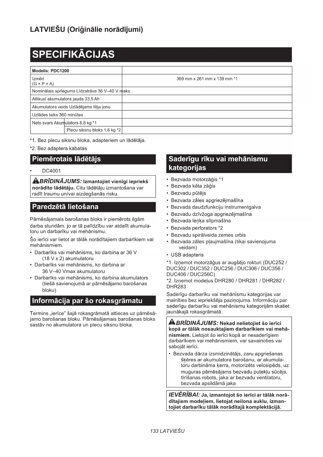 - Olkaimet HUOMAA: Jotkin luettelossa mainitut varusteet voi- vat sisältyä työkalun toimitukseen vakiovarusteina. Ne voivat vaihdella maittain.133 LATVIEŠU LATVIEŠU (Oriģinālie norādījumi) SPECIFIKĀCIJAS Modelis: PDC1200 Izmēri (G × P × A) 369 mm x 261 mm x 139 mm *1 Nominālais spriegums Līdzstrāva 36 V–40 V maks. Atlikusī akumulatora jauda 33,5 Ah Akumulatora veids Uzlādējams litija jonu Uzlādes laiks 360 minūtes Neto svars Akumulators 8,8 kg *1 Plecu siksnu bloks 1,6 kg *2 *1. Bez plecu siksnu bloka, adapteriem un lādētāja. *2. Bez adaptera kabatas Piemērotais lādētājs