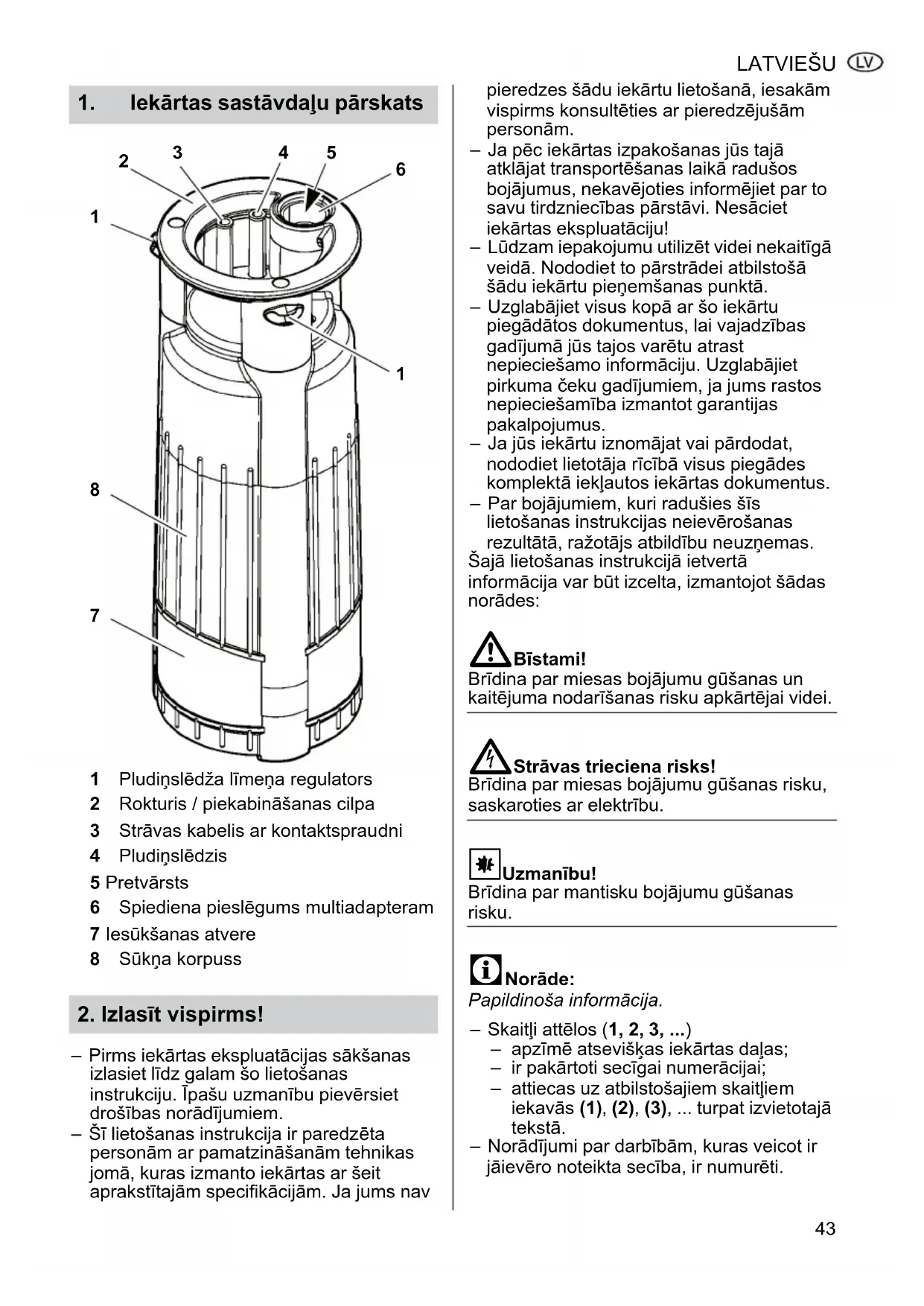 –Iekārtas izmantošanas laikā ievērojiet tālāk sniegtos drošības norādījumus, lai netiktu apdraudēta cilvēku drošība un tiktu novērsti mantiskie bojājumi. –Ievērojiet likuma priekšrakstus vai nelaimes gadījumu novēršanas noteikumus, kuri attiecas uz iegremdējamo sūkņu lietošanu. – Izmantojot sūkni peldbaseinos un dārza dīķos, kā arī to aizsargzonās, ievērojiet noteikumus, kas ir ietverti tiesību normā DIN VDE 0100 -702, -738. Šajā gadījumā ievērojiet arī vietējās pašvaldības sastādītos tehniskos noteikumus. –Iekārtai ir jāizveido drošinātājaizsardzība, izmantojot noplūdes strāvas aizsargslēdzi (RCD) ar maksimālo nominālo noplūdes strāvas vērtību 30 mA. AVispārējs apdraudējums! Neekspluatējiet iekārtu, ja cilvēki atrodas kontaktā ar sūknējamo šķidrumu (piem., peldbaseinā vai dārza dīķī)! Tālāk minētie atlikušie riski pastāv vairumā gadījumu, ekspluatējot iegremdējamos sūkņus –tos nav iespējams pilnībā novērst, pat veicot drošības pasākumus. AApdraudējums apkārtējas vides faktoru ietekmes dēļ! Neizmantojiet iekārtu sprādzienbīstamās telpās vai degošu šķidrumu vai gāzu tuvumā! BApdraudējums, saskaroties ar elektrību! Neaizskart tīkla kontaktspraudni ar slapjām tokām! Tīkla kontaktspraudni vienmēr atvienot no elektrotīkla tieši pie rozetes, nekad šim mērķim neizmantot kabeli. Iekārtu drīkst pieslēgt tikai pie kontaktrozetēm ar zemēšanas kontaktu, kuras ir pareizi uzstādītas, sazemētas un pārbaudītas. Tīkla spriegumam un drošinātājiem ir jāatbilst tehnisko parametru sadaļā ietvertajām norādēm. Iekārtu vienmēr celt un pārvietot aiz roktura, nekad necelt to aiz pieslēguma kabeļa vai spiediena šļūtenes.