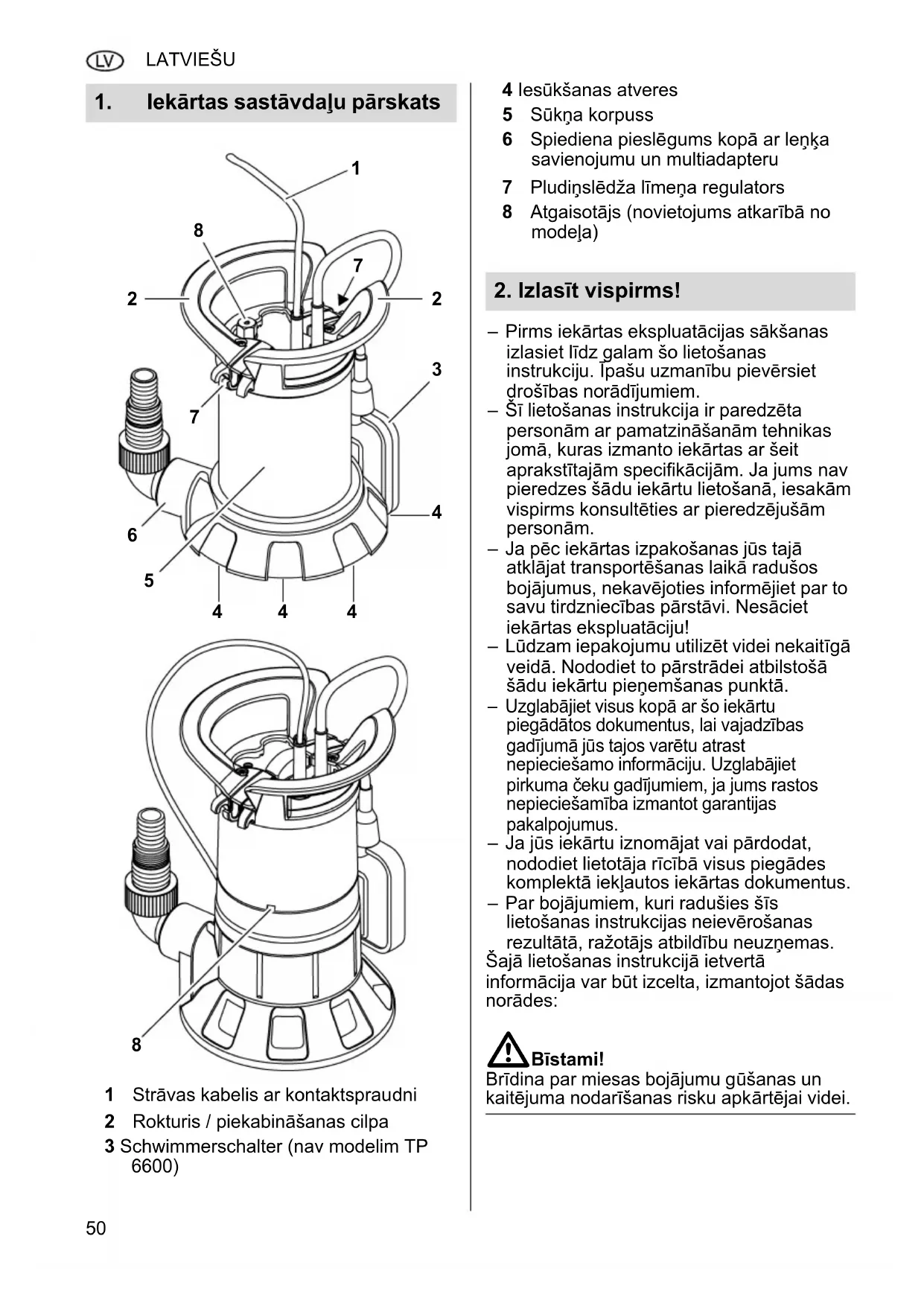 LATVIEŠU AVispārējs apdraudējums! Neekspluatējiet iekārtu, ja cilvēki atrodas kontaktā ar sūknējamo šķidrumu (piem., peldbaseinā vai dārza dīķī)! Tālāk minētie atlikušie riski pastāv vairumā gadījumu, ekspluatējot iegremdējamos sūkņus –tos nav iespējams pilnībā novērst, pat veicot drošības pasākumus. AApdraudējums apkārtējas vides faktoru ietekmes dēļ! Neizmantojiet iekārtu sprādzienbīstamās telpās vai degošu šķidrumu vai gāzu tuvumā! ABīstami! Karsts ūdens! Ja spiedienreleja izslēgšanās spiediens netiek sasniegts slikta spiediena vai bojāta spiedienreleja dēļ, ūdens ierīcē iekšējās cirkulācijas rezultātā var sakarst. Tas var izraisīt ierīces un pieslēguma vadu bojājumus un sūci, un tāpēc var izplūst karsts ūdens. Applaucēšanās risks! Ierīci pret noslēgtu spiedvadu darbināt ne ilgāk kā 5 minūtes. Atvienot ierīci no elektrības tīkla un ļaut atdzist. Pirms atkārtotas iedarbināšanas kvalificētam speciālistam jāpārbauda, vai iekārta darbojas nevainojami. BApdraudējums, saskaroties ar elektrību! Neaizskart tīkla kontaktspraudni ar slapjām tokām! Tīkla kontaktspraudni vienmēr atvienot no elektrotīkla tieši pie rozetes, nekad šim mērķim neizmantot kabeli. Iekārtu drīkst pieslēgt tikai pie kontaktrozetēm ar zemēšanas kontaktu, kuras ir pareizi uzstādītas, sazemētas un pārbaudītas. Tīkla spriegumam un drošinātājiem ir jāatbilst tehnisko parametru sadaļā ietvertajām norādēm. Iekārtu vienmēr celt un pārvietot aiz roktura, nekad necelt to aiz pieslēguma kabeļa vai spiediena šļūtenes. Pagarinātājiem ir jābūt pietiekamam šķērsgriezumam. Kabelim ir jābūt līdz galam notītam no spoles. Nelocīt, nespiest, nevilkt vai nebraukt pāri strāvas kabelim un pagarinātājam; aizsargāt tos no asām šķautnēm, eļļas un karstuma. Pagarinātāju izvietot tā, lai tas nevarētu iekrist sūknējamajā šķidrumā. Pirms darbu veikšanas pie iekārtas atvienot kontaktspraudni no elektrotīkla. BStrāvas trieciena risks bojājumu dēļ iekārtā! Pirms katras sūkņa ekspluatācijas reizes pārbaudiet, vai tajā nav radušies bojājumi, īpašu uzmanību pievēršot tīkla kabelim un pagarinātājam, tīkla kontaktspraudnim un pludiņslēdzim. Draudi dzīvībai, saņemot strāvas triecienu! Nelabojiet iekārtu pats! Neprofesionāli veicot iekārtas remontu, pastāv šķidruma ieplūšanas risks sūkņa elektrosistēmas nodalījumā. AUzmanību! Lai izvairītos no ūdens izraisītiem bojājumiem, piemēram, applūdinātām telpām, ko var izraisīt ierīces traucējumi vai defekti: jāieplāno piemēroti drošības pasākumi, piemēram: – trauksmes sistēma vai –savākšanas trauks ar kontrolierīci. Ražotājs neuzņemas atbildību par iespējamajiem zaudējumiem, kuri radušies,