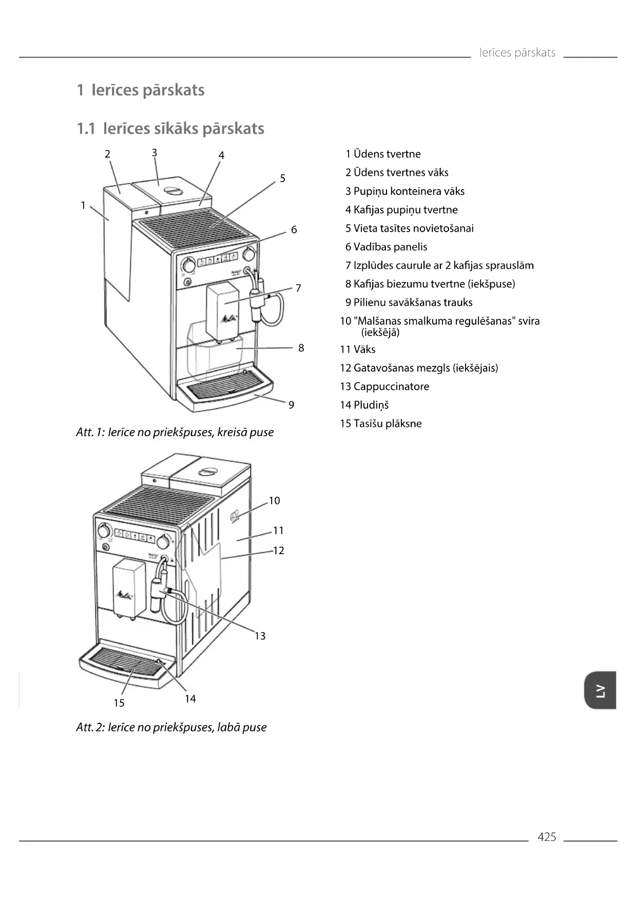 Att. 2: Ierīce no priekšpuses, labā puse 1 Ūdens tvertne 2 Ūdens tvertnes vāks 3 Pupiņu konteinera vāks 4 Kajas pupiņu tvertne 5 Vieta tasītes novietošanai 6 Vadības panelis 7 Izplūdes caurule ar 2 kajas sprauslām 8 Kajas biezumu tvertne (iekšpuse) 9 Pilienu savākšanas trauks 10 "Malšanas smalkuma regulēšanas" svira (iekšējā) 11 Vāks 12 Gatavošanas mezgls (iekšējais) 13 Cappuccinatore 14 Pludiņš 15 Tasīšu plāksneIerīces pārskats