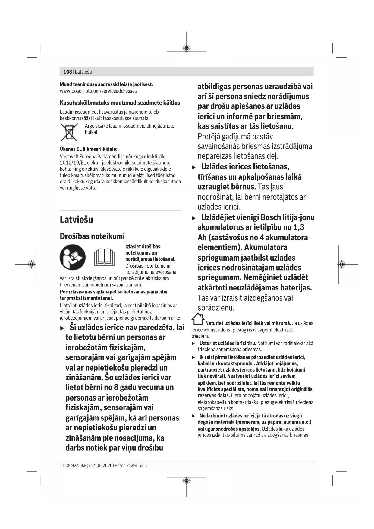 – 4,0Ah min 23 / 37 – 5,0Ah min 28 / 47 – 6,0Ah min 32 / 57 Citi uzlādes laiki www.bosch-professional.com Akumulatora elementu skaits 4–15 Svars atbilstīgi EPTA-Procedure01:2014 kg 1,8 Elektroaizsardzības klase / II A) Atbilstoši akumulatora temperatūrai un akumulatora tipam B) Akumulatora uzlādes pakāpe apt. 80%. Akumulatoru var izņemt un nekavējoties uzsākt tā lietošanu. C) Akumulatora uzlādes pakāpe 95 %–100 %. Lietošana Lietošanas sākšana u Nodrošiniet pareiza elektrotīkla sprieguma padevi! Elektrobarošanas avota spriegumam jāatbilst vērtībai, kas ir norādīta uz uzlādes ierīces marķējuma plāksnītes. Uzlādes ierīces, ko paredzēts darbināt ar 230V spriegumu, var darboties arī ar 220V spriegumu. Uzlādes process Akumulatori (1) tiek lādēti viens pēc otra divos uzlādes ciklos. – Pirmajā uzlādes ciklā notiek visu ievietoto akumulatoru uzlāde līdz apm. 80% kapacitātes. – Otrajā uzlādes ciklā uzlāde notiek aptuveni no 80% līdz 100% kapacitātes. Otrs cikls sākas, kad visi ievietotie akumulatori ir uzlādēti aptuveni par 80%. Pārliecinieties, vai uzlādes nišas (2) un akumulatora kontakti nav netīri. Pārliecinieties, vai visi akumulatori ir pilnībā iesprausti. Uzlādes process sākas, tiklīdz kontaktdakša ir iesprausta un akumulators ir ievietots. Uzlādes process tiek sākts vienlaikus ar vairākiem akumulatoriem, tie tiek lādēti viens pēc otra, kā norādīts ar bultiņām (6) (pretēji pulksteņrādītāju virzienam). Ja akumulatora uzlādes stāvoklis ir vairāk nekā apm.80%, pirmajā uzlādes ciklā tas tiek izlaists un tiek lādēts otrajā Bosch Power Tools 1 609 92A 5KP | (17.08.2020)110 | Latviešu ciklā (no apm.80% līdz apm.100%). Ja otra uzlādes cikla laikā (no apm.80% līdz apm.100%) tiek ievietots jauns akumulators ar uzlādes stāvokli apm.80%, tas uzreiz tiek lādēts. Pēc tam kad šis akumulators ir uzlādēts par apm.80%, uzlādes secība tiek noteikta no jauna. Nākamais akumulators, kas tiek lādēts otrajā uzlādes ciklā (no apm.80% līdz apm.100%), seko bultiņu secībā (6), kas dotas uz uzlādes ierīces (pretēji pulksteņrādītāju virzienam). Viedajā uzlādes procesā automātiski tiek noteikta akumulatora uzlādes pakāpe un tiek nodrošināta optimāla uzlādes strāva atbilstoši akumulatora temperatūrai un akumulatora spriegumam. Tā tiek nodrošināta saudzīga akumulatora uzlāde; ja akumulatoru atstāj uzlādes ierīcē, tas tiek pastāvīgi uzturēts pilnas uzlādes stāvoklī. Norāde: uzlādi var veikt tikai tad, ja akumulatora temperatūra ir pieļaujamajā uzlādes temperatūras diapazonā, kā norādīts sadaļā „Tehniskie dati”. Prioritātes taustiņš (Priority Start) (3) Pie katras uzlādes šahtas (2) atrodas prioritātes taustiņš (3) tūlītējai uzlādes procesa sākšanai šajā uzlādes šahtā. – Vienu reizi nospiežot prioritātes taustiņu (3), akumulators šajā uzlādes šahtā tiek prioritāri uzlādēts līdz apm.80% no tā kapacitātes (pirmais uzlādes cikls). Uzlādes procesam sākoties, īslaicīgi iedegas pirmās četras akumulatora uzlādes stāvokļa indikācijas gaismas diodes (4). Kad akumulators ir uzlādēts līdz apm.80%, bultiņas virzienā (6) tiek lādēts nākamais akumulators (pretēji pulksteņrādītāju kustības virzienam). – Divreiz nospiežot prioritātes taustiņu (3), akumulators šajā uzlādes šahtā tiek prioritāri uzlādēts līdz apm.100%. Uzlādes procesam sākoties, īslaicīgi iedegas piecas akumulatora uzlādes stāvokļa indikācijas gaismas diodes (4). Pēc šī uzlādes procesa pabeigšanas tiek uzlādēti citi akumulatori līdz apm.80%. Ja kāds akumulators (1) prioritāri pilnībā uzlādēts, notiek pāreja uz akumulatoru nākamajā uzlādes šahtā. Uzlādēšanas secība notiek uz uzlādes ierīces uzdrukāto bultiņu (6) secībā (pretēji pulksteņrādītāju kustības virzienam). Indikācijas elementu nozīme Zaļais akumulatora uzlādes pakāpes indikators (4) Ievietojot akumulatoru (1), attiecīgais akumulatora uzlādes pakāpes indikators (4) parāda uzlādes stāvokli. Uzlādes laikā ilgstoši degošās gaismas diodes parāda uzlādēto akumulatora kapacitāti. Pēc kārtas mirgojošas gaismas diodes (process) parāda kapacitāti, kāda šobrīd tiek lādēta. Stāvokļa uzlādes indikācijas gaismas diodes attiecas uz akumulatoru (1) uzlādes procesa laikā un pēc tā. Gaismas diodes Akumulatora uzlādes pakāpe, apt. Pirmā gaismas diode deg pastāvīgi. ≥ 20% Pirmās divas gaismas diodes deg pastāvīgi. ≥ 40% Pirmās trīs gaismas diodes deg pastāvīgi. ≥ 60% Pirmās četras gaismas diodes deg pastāvīgi. ≥ 80% Pastāvīgi deg piecas gaismas diodes. > 95% Norāde: uzlādi var veikt tikai tad, ja akumulatora temperatūra ir pieļaujamajā uzlādes temperatūras diapazonā, kā norādīts sadaļā „Tehniskie dati”. Uzlādes šahtas (2) miera režīmā akumulatora uzlādes pakāpes indikatora pirmā gaismas diode (4) pastāvīgi deg zaļā krāsā. Sarkanais temperatūras kontroles / kļūmes indikators (5) Deg pastāvīgi Pastāvīgi degošs sarkanais indikators signalizē, ka akumulatora temperatūra atrodas ārpus pieļaujamo uzlādes temperatūras vērtību diapazona robežām; skatīt sadaļu „Tehniskie dati“. Uzlādes process sākas, tiklīdz temperatūra atgriežas pieļaujamo uzlādes temperatūras vērtību diapazonā. Mirgo Mirgojošs sarkanais indikators signalizē, ka akumulators šajā uzlādes šahtā ir bojāts. Seši vienlaikus mirgojoši sarkani indikatori signalizē, ka uzlādes ierīce ir bojāta. Kļūmes – cēloņi un novēršana Iemesls Novēršana Sarkanais temperatūras kontroles/kļūdas indikators (5) mirgo (atsevišķi pie uzlādes šahtas) Uzlādes process nevar notikt Akumulators nav (pareizi) ievietots uzlādes ierīcē Pareizi ievietojiet akumulatoru uzlādes ierīcē Akumulatora un lādētāja kontakti netīri Tīriet akumulatora un l