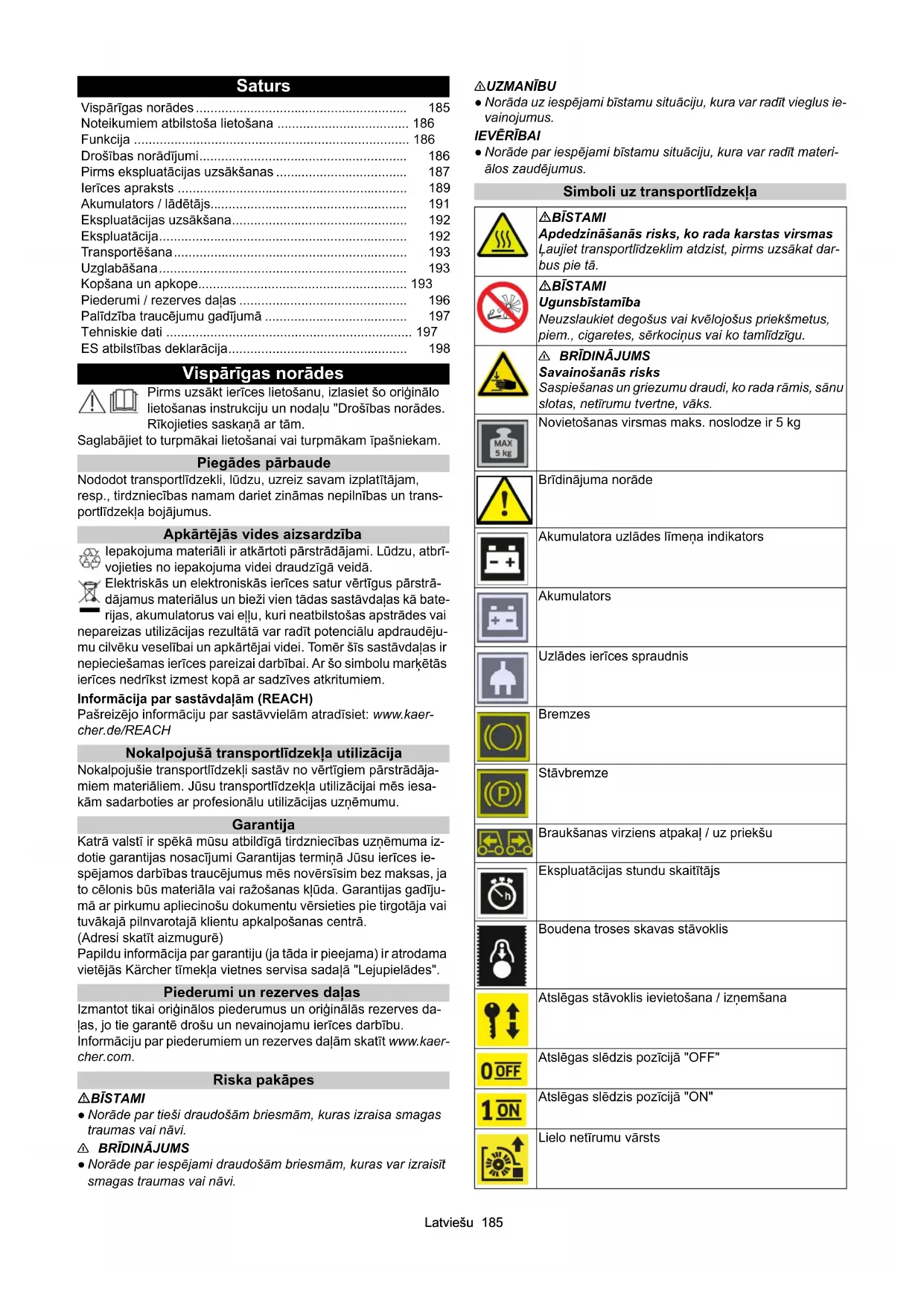 dB(A)333 KM 85/50 W Bp (1.351-116.0) KM 85/50 W Bp *IN (1.351-118.0) KM 85/50 W Bp Pack (1.351-117.0) KM 85/50 W Bp Pack 2SB (1.351-119.0)Latviešu 185 Saturs Vispārīgas norādes Pirms uzsākt ierīces lietošanu, izlasiet šo oriģinālo lietošanas instrukciju un nodaļu "Drošības norādes. Rīkojieties saskaņā ar tām. Saglabājiet to turpmākai lietošanai vai turpmākam īpašniekam. Piegādes pārbaude Nododot transportlīdzekli, lūdzu, uzreiz savam izplatītājam, resp., tirdzniecības namam dariet zināmas nepilnības un trans- portlīdzekļa bojājumus. Apkārtējās vides aizsardzība Iepakojuma materiāli ir atkārtoti pārstrādājami. Lūdzu, atbrī- vojieties no iepakojuma videi draudzīgā veidā. Elektriskās un elektroniskās ierīces satur vērtīgus pārstrā- dājamus materiālus un bieži vien tādas sastāvdaļas kā bate- rijas, akumulatorus vai eļļu, kuri neatbilstošas apstrādes vai nepareizas utilizācijas rezultātā var radīt potenciālu apdraudēju- mu cilvēku veselībai un apkārtējai videi. Tomēr šīs sastāvdaļas ir nepieciešamas ierīces pareizai darbībai. Ar šo simbolu marķētās ierīces nedrīkst izmest kopā ar sadzīves atkritumiem. Informācija par sastāvdaļām (REACH) Pašreizējo informāciju par sastāvvielām atradīsiet: www.kaer- cher.de/REACH Nokalpojušā transportlīdzekļa utilizācija Nokalpojušie transportlīdzekļi sastāv no vērtīgiem pārstrādāja- miem materiāliem. Jūsu transportlīdzekļa utilizācijai mēs iesa- kām sadarboties ar profesionālu utilizācijas uzņēmumu. Garantija Katrā valstī ir spēkā mūsu atbildīgā tirdzniecības uzņēmuma iz- dotie garantijas nosacījumi Garantijas termiņā Jūsu ierīces ie- spējamos darbības traucējumus mēs novērsīsim bez maksas, ja to cēlonis būs materiāla vai ražošanas kļūda. Garantijas gadīju- mā ar pirkumu apliecinošu dokumentu vērsieties pie tirgotāja vai tuvākajā pilnvarotajā klientu apkalpošanas centrā. (Adresi skatīt aizmugurē) Papildu informācija par garantiju (ja tāda ir pieejama) ir atrodama vietējās Kärcher tīmekļa vietnes servisa sadaļā "Lejupielādes". Piederumi un rezerves daļas Izmantot tikai oriģinālos piederumus un oriģinālās rezerves da- ļas, jo tie garantē drošu un nevainojamu ierīces darbību. Informāciju par piederumiem un rezerves daļām skatīt www.kaer- cher.com. Riska pakāpes BĪSTAMI ● Norāde par tieši draudošām briesmām, kuras izraisa smagas traumas vai nāvi.