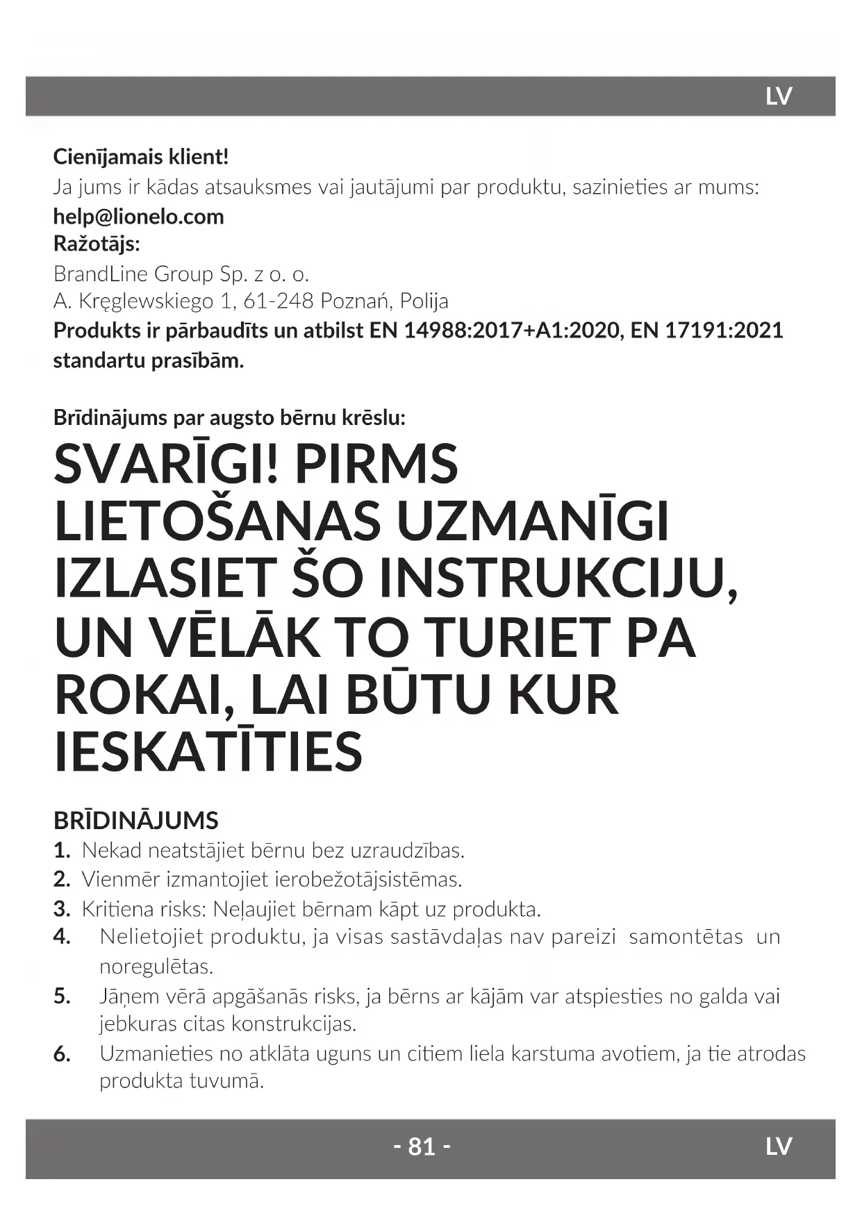 Cienījamais klient! Ja jums ir kādas atsauksmes vai jautājumi par produktu, saziniees ar mums: help@lionelo.com Ražotājs: BrandLine Group Sp. z o. o. A. Kręglewskiego 1, 61-248 Poznań, Polija Produkts ir pārbaudīts un atbilst EN 14988:2017+A1:2020, EN 17191:2021 standartu prasībām. Brīdinājums par augsto bērnu krēslu:
