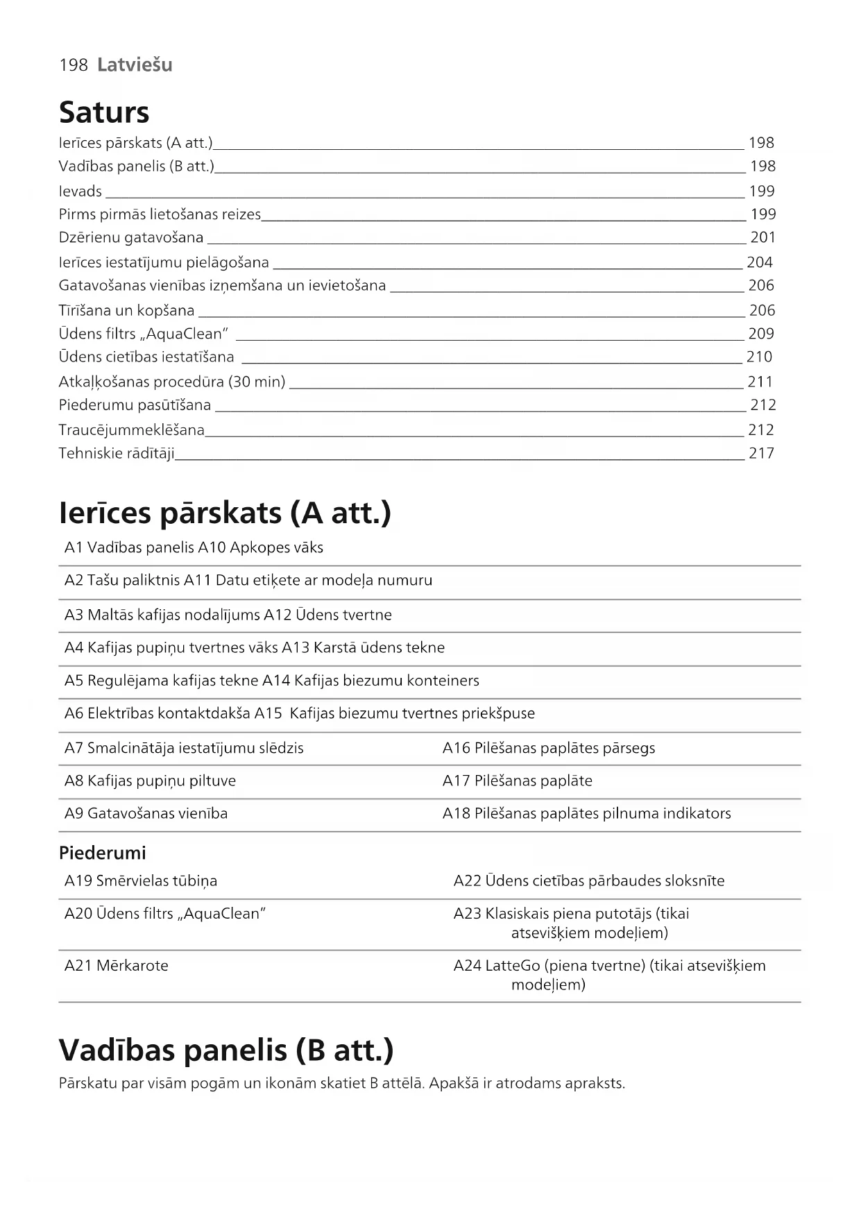 Latviešu Saturs Ierīces pārskats (Aatt.)_____________________________________________________________________ 198 Vadības panelis (B att.)_____________________________________________________________________ 198 Ievads ___________________________________________________________________________________ 199 Pirms pirmās lietošanas reizes_______________________________________________________________ 199 Dzērienu gatavošana ______________________________________________________________________ 201 Ierīces iestatījumu pielāgošana _____________________________________________________________ 204 Gatavošanas vienības izņemšana un ievietošana ______________________________________________ 206 Tīrīšana un kopšana _______________________________________________________________________ 206 Ūdens filtrs „AquaClean” __________________________________________________________________ 209 Ūdens cietības iestatīšana _________________________________________________________________ 210 Atkaļķošanas procedūra (30min) ___________________________________________________________ 211 Piederumu pasūtīšana _____________________________________________________________________ 212 Traucējummeklēšana______________________________________________________________________ 212 Tehniskie rādītāji__________________________________________________________________________ 217 Ierīces pārskats (Aatt.) A1 Vadības panelis A10 Apkopes vāks A2 Tašu paliktnis A11 Datu etiķete ar modeļa numuru A3 Maltās kafijas nodalījums A12 Ūdens tvertne A4 Kafijas pupiņu tvertnes vāks A13 Karstā ūdens tekne A5 Regulējama kafijas tekne A14 Kafijas biezumu konteiners A6 Elektrības kontaktdakša A15 Kafijas biezumu tvertnes priekšpuse A7 Smalcinātāja iestatījumu slēdzis A16 Pilēšanas paplātes pārsegs A8 Kafijas pupiņu piltuve A17 Pilēšanas paplāte A9 Gatavošanas vienība A18 Pilēšanas paplātes pilnuma indikators Piederumi A19 Smērvielas tūbiņa A22 Ūdens cietības pārbaudes sloksnīte A20 Ūdens filtrs „AquaClean” A23 Klasiskais piena putotājs (tikai atsevišķiem modeļiem) A21 Mērkarote A24 LatteGo (piena tvertne) (tikai atsevišķiem modeļiem) Vadības panelis (B att.) Pārskatu par visām pogām un ikonām skatiet B attēlā. Apakšā ir atrodams apraksts.199 Latviešu Latviešu Dažas pogas/ikonas ir paredzētas tikai konkrētiem tipiem. B1 Ieslēgšanas/izslēgšanas poga B7 Brīdinājuma ikonas B2 Dzēriena ikonas* B8 Sākšanas indikators B3 Aromāta stipruma/ maltās kafijas ikona B9 Palaišana/apturēšana poga B4 Dzēriena daudzuma ikona B10 „Calc / Clean” funkcijas ikona B5 Piena daudzuma ikona (tikai konkrētiem tipiem) B11 AquaClean funkcijas ikona B6 Kafijas temperatūras ikona (tikai konkrētiem tipiem) *Dzērienu ikonas (tikai noteiktiem modeļiem): espreso, espreso lungo, kafija, ledus kafija, kapučīno, late makjato, karstais ūdens, tvaiks Ievads Apsveicam ar jūsu Philips pilnīgi automātiskā kafijas automāta pirkumu! Lai pilnībā izmantotu mūsu piedāvātās atbalsta iespējas, lūdzu, reģistrējiet savu izstrādājumu www.philips.com/welcome. Pirms izmantojat ierīci pirmo reizi, uzmanīgi izlasiet atsevišķo drošības brošūru un saglabājiet to, lai vajadzības gadījumā varētu ieskatīties tajā arī turpmāk. Lai palīdzētu jums uzsākt un izmantot kafijas automātu pēc iespējas efektīvāk, mēs piedāvājam dažādu veidu atbalstu. Iepakojuma saturs: 1 Īsā lietošanas instrukcija ar attēlu norādēm un informāciju par tīrīšanu un apkopi. 2 Atsevišķā drošības brošūra, kas satur norādījumus par ierīces drošu lietošanu. 3 Lai saņemtu tiešsaistes atbalstu (šī paplašinātā lietošanas pamācība, bieži uzdotie jautājumi, video pamācības u.c.), noskenējiet QR kodu uz brošūras vāka, lai lejupielādētu lietotni Coffee+, vai apmeklējiet vietni www.philips.com/coffee-care. Ir pieejamas vairākas šī espreso automāta versijas, un tām visām ir atšķirīgas funkcijas. Katrai versijai ir savs modeļa numurs. Modeļa numurs ir redzams uz datu etiķetes apkopes durtiņu iekšpusē (skatīt A11 att.). Šī ierīce ir pārbaudīta ar kafiju. Arī rūpīgi iztīrītā ierīcē iespējamas kafijas paliekas. Tomēr mēs garantējam, ka ierīce ir pavisam jauna. Šī ierīce automātiski pielāgo maltās kafijas daudzumu, kas tiek izmantots visgaršīgākās kafijas pagatavošanai. Lai ļautu ierīcei pabeigt tās pašregulāciju, pirmajā lietošanas reizē jāpagatavo piecas kafijas porcijas. Pirms pirmās lietošanas reizes noteikti jāizskalo „LatteGo” (piena tvertne) vai klasiskais piena putotājs. Pirms pirmās lietošanas reizes