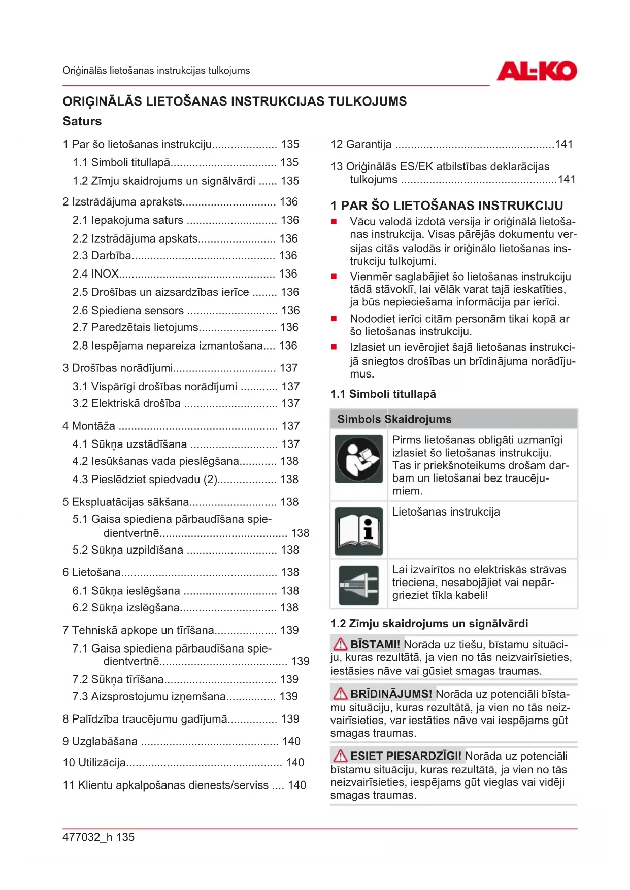 DIENESTS/SERVISS Jautājumu gadījumā par garantiju, remontu vai rezerves daļām sazinieties ar tuvāko AL-KOser-477032_h 141 Garantija visa centru. Informāciju par tiem meklējiet šādā vietnē: www.alko-garden.com/service-contacts Vairāk informācijas par rezerves daļām varat ska- tīt: www.alko-garden.com/spareparts 12 GARANTIJA Iespējamos materiāla vai ražošanas brāķus iekārtā mēs novērsīsim atbilstoši likumā noteiktajam noil- guma termiņam attiecībā uz garantijas prasībām, paturot tiesības izvēlēties remontu vai jaunas preces piegādi. Noilguma termiņš tiek noteikts, vadoties pēc tās valsts spēkā esošās likumdošanas, kurā ierī- ce tika nopirkta. Mūsu garantijas pakalpojumi ir spēkā tikai tad, ja: