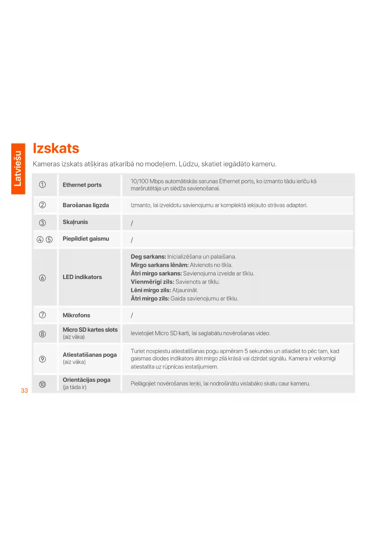 Izmanto, lai izveidotu savienojumu ar komplektā iekļauto strāvas adapteri. 10/100 Mbps automātiskās sarunas Ethernet ports, ko izmanto tādu ierīču kā maršrutētāja un slēdža savienošanai. Deg sarkans: Inicializēšana un palaišana. Mirgo sarkans lēnām: Atvienots no tīkla. Ātri mirgo sarkans: Savienojuma izveide ar tīklu. Vienmērīgi zils: Savienots ar tīklu. Lēni mirgo zils: Atjaunināt. Ātri mirgo zils: Gaida savienojumu ar tīklu. Ievietojiet Micro SD karti, lai saglabātu novērošanas video. Turiet nospiestu atiestatīšanas pogu apmēram 5 sekundes un atlaidiet to pēc tam, kad gaismas diodes indikators ātri mirgo zilā krāsā vai dzirdat signālu. Kamera ir veiksmīgi atiestatīta uz rūpnīcas iestatījumiem. Pielāgojiet novērošanas leņķi, lai nodrošinātu vislabāko skatu caur kameru. Piepildiet gaismu LED indikators Mikrofons Skaļrunis