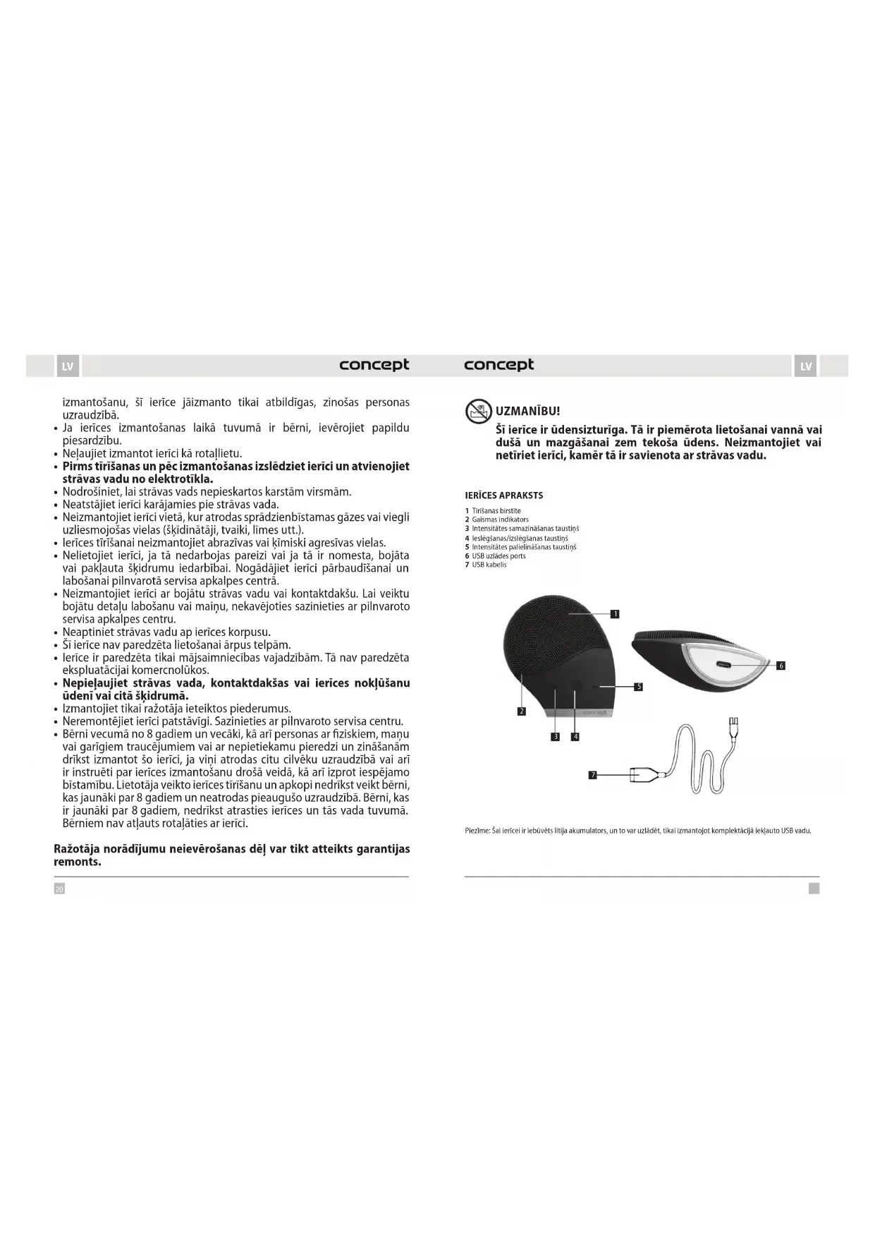 - Polietilēna (PE) maisiņus nododiet otrreizējai pārstrādei paredzēto materiālu savākšanas punktā. Ierīces otrreizējā pārstrāde tās kalpošanas laika beigās Šī ierīce ir marķēta saskaņā ar Eiropas Parlamenta un Padomes Direktīvu 2012/19/EU par elektrisko un elektronisko iekārtu atkritumiem (WEEE). Simbols uz izstrādājuma vai tā iepakojuma norāda, ka šis izstrādājums nepieder sadzīves atkritumiem. Tas jānogādā elektrisko un elektronisko iekārtu otrreizējās pārstrādes savākšanas punktā. Nodrošinot šā izstrādājuma pareizu iznīcināšanu, tiks novērsta nelabvēlīga ietekme uz vidi un cilvēku veselību, ko var izraisīt nepareiza ierīces iznīcināšana. Iznīcināšana jāveic saskaņā ar noteikumiem par atkritumu apstrādi. Lai iegūtu papildu informāciju par šīs ierīces otrreizēju pārstrādi, lūdzu, sazinieties ar vietējās pašvaldības sadzīves atkritumu iznīcināšanas dienestu vai veikalu, kurā iegādājāties izstrādājumu. Šis izstrādājums atbilst visām piemērojamo EU direktīvu pamatprasībām. Izmaiņas tekstā, konstrukcijā un tehniskajās specifikācijās var tikt veiktas bez iepriekšēja brīdinājuma, un mēs paturam tiesības veikt šīs izmaiņas. Acknowledgements Thank you for purchasing a Concept product. We wish you much joy with your new appliance every day you use it. Please read the instruction manual carefully before initial use. To refer to this manual any time you need to, we recommend you to keep it in a safe place. And please pass it to any future owner of the appliance. Technical specifications Voltage 5 V Current ≤250 mA Water resistance IPX7 Battery type built-in lithium battery Charging time ≤3 hours Operating time 2 min Operating time at full charge (total) ≥3 hours (at maximum power)