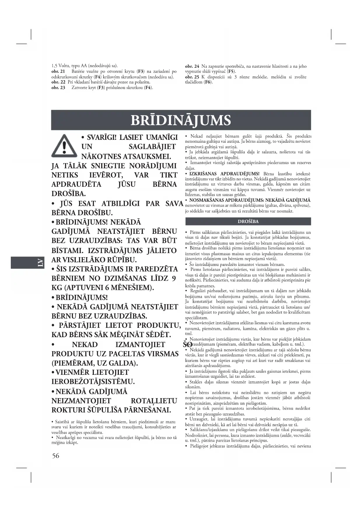 - Izstrādājumu nav paredzēts izmantot bērna nešanai. Nekādā gadījumā nenesiet vai neceliet izstrādājumu, ja tajā atrodas bērns.