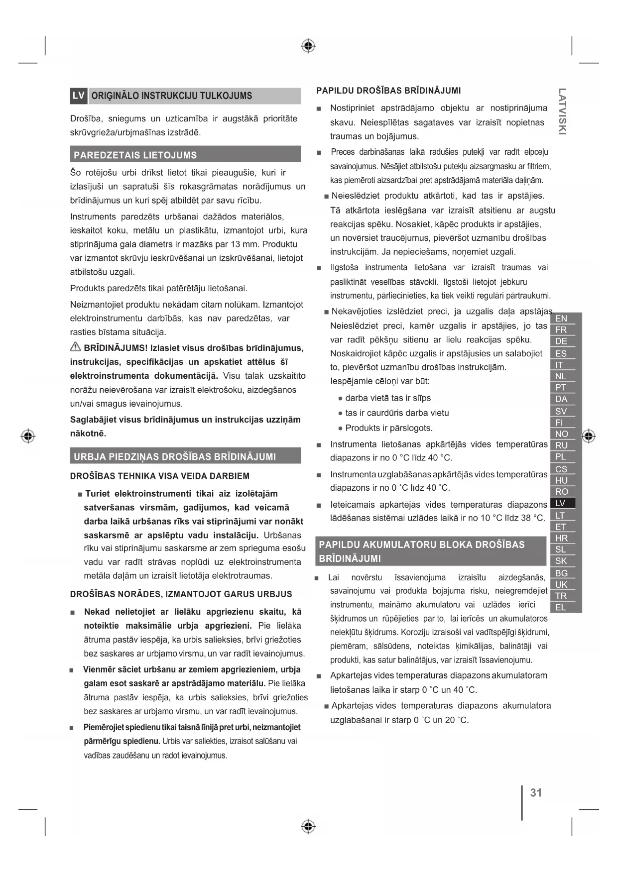 Drošības brīdinājums Līdzstrāva Griezes moments, Maksimālā Griezes moments, Minimālā Ātrums, minimālais Ātrums, maksimālais Pirms iedarbinat mašinu, ludzu rupigi izlasiet instrukcijas. Neizmetiet akumulatoru atkritumus kā nešķirotus sadzīves atkritumus. Akumulatoru atkritumi, elektrisko un elektronisko iekārtu atkritumi jāsavāc atsevišķi. Bateriju, akumulatoru un gaismas avotu atkritumi ir jāizņem no iekārtām. Sazinieties ar vietējo pašvaldību vai mazumtirgotāju, lai saņemtu ieteikumus pārstrādei un savākšanas punktus. Saskaņā ar vietējiem noteikumiem mazumtirgotājiem var būt pienākums bez maksas pieņemt atpakaļ akumulatoru, elektrisko un elektronisko iekārtu atkritumus. Jūsu ieguldījums elektrisko un elektronisko iekārtu atkritumu otrreizējā izmantošanā un otrreizējā pārstrādē palīdz samazināt izejvielu pieprasījumu. Akumulatoru atkritumi, it īpaši tie, kas satur litiju, un elektrisko un elektronisko iekārtu atkritumi satur vērtīgus un pārstrādājamus materiālus, kas var nelabvēlīgi ietekmēt vidi un cilvēku veselību, ja tos neapglabā videi draudzīgā veidā. Izdzēsiet no atkritumos nododamajām iekārtām personīgos datus, ja tādi tur ir. 32LT