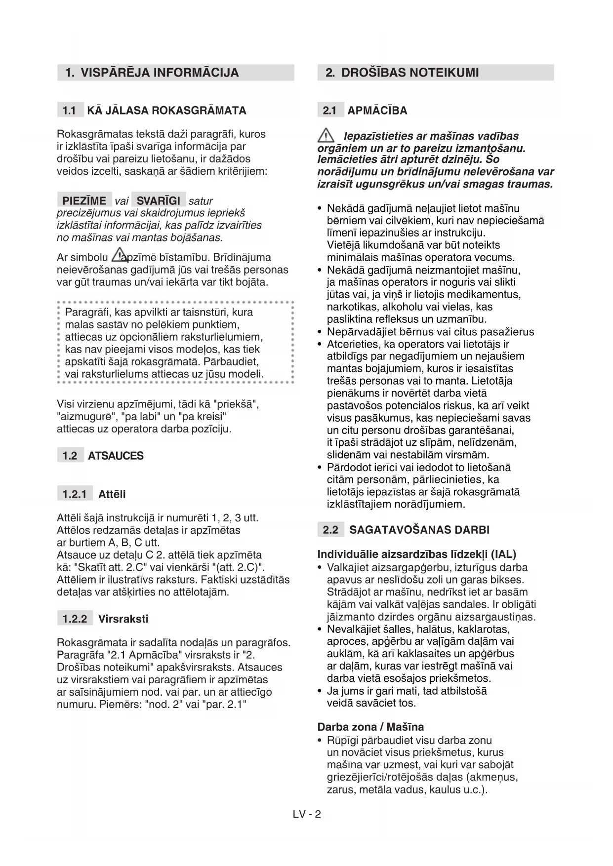 Rokasgrāmatas tekstā daži paragrā, kuros ir izklāstīta īpaši svarīga informācija par drošību vai pareizu lietošanu, ir dažādos veidos izcelti, saskaņā ar šādiem kritērijiem: PIEZĪME vai SVARĪGI satur precizējumus vai skaidrojumus iepriekš izklāstītai informācijai, kas palīdz izvairīties no mašīnas vai mantas bojāšanas. Ar simbolu apzīmē bīstamību. Brīdinājuma neievērošanas gadījumā jūs vai trešās personas var gūt traumas un/vai iekārta var tikt bojāta. Paragrā, kas apvilkti ar taisnstūri, kura malas sastāv no pelēkiem punktiem, attiecas uz opcionāliem raksturlielumiem, kas nav pieejami visos modeļos, kas tiek apskatīti šajā rokasgrāmatā. Pārbaudiet, vai raksturlielums attiecas uz jūsu modeli. Visi virzienu apzīmējumi, tādi kā "priekšā", "aizmugurē", "pa labi" un "pa kreisi" attiecas uz operatora darba pozīciju.