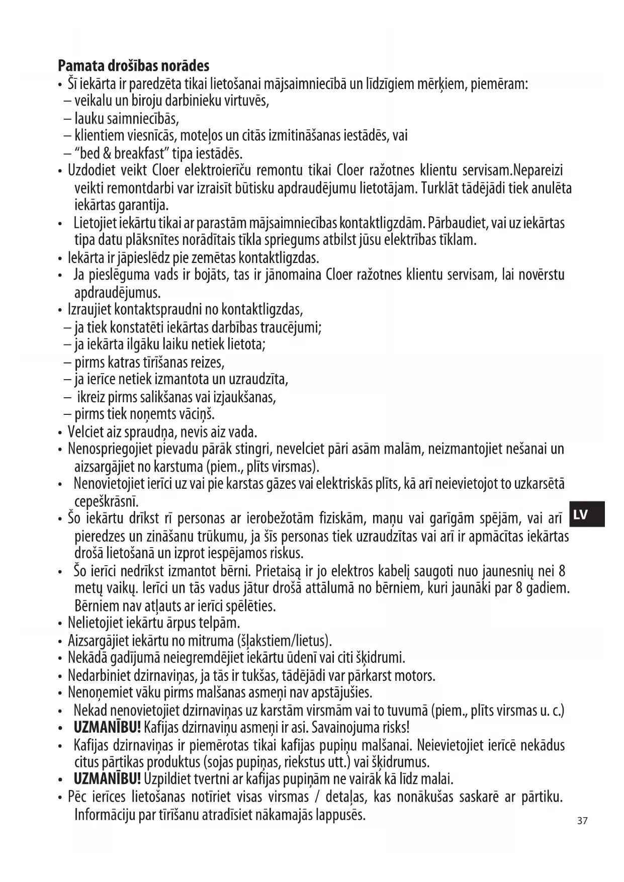 - Šo ierīci nedrīkst izmantot bērni. Prietaisą ir jo elektros kabelį saugoti nuo jaunesnių nei 8 metų vaikų. Ierīci un tās vadus jātur drošā attālumā no bērniem, kuri jaunāki par 8 gadiem. Bērniem nav atļauts ar ierīci spēlēties.