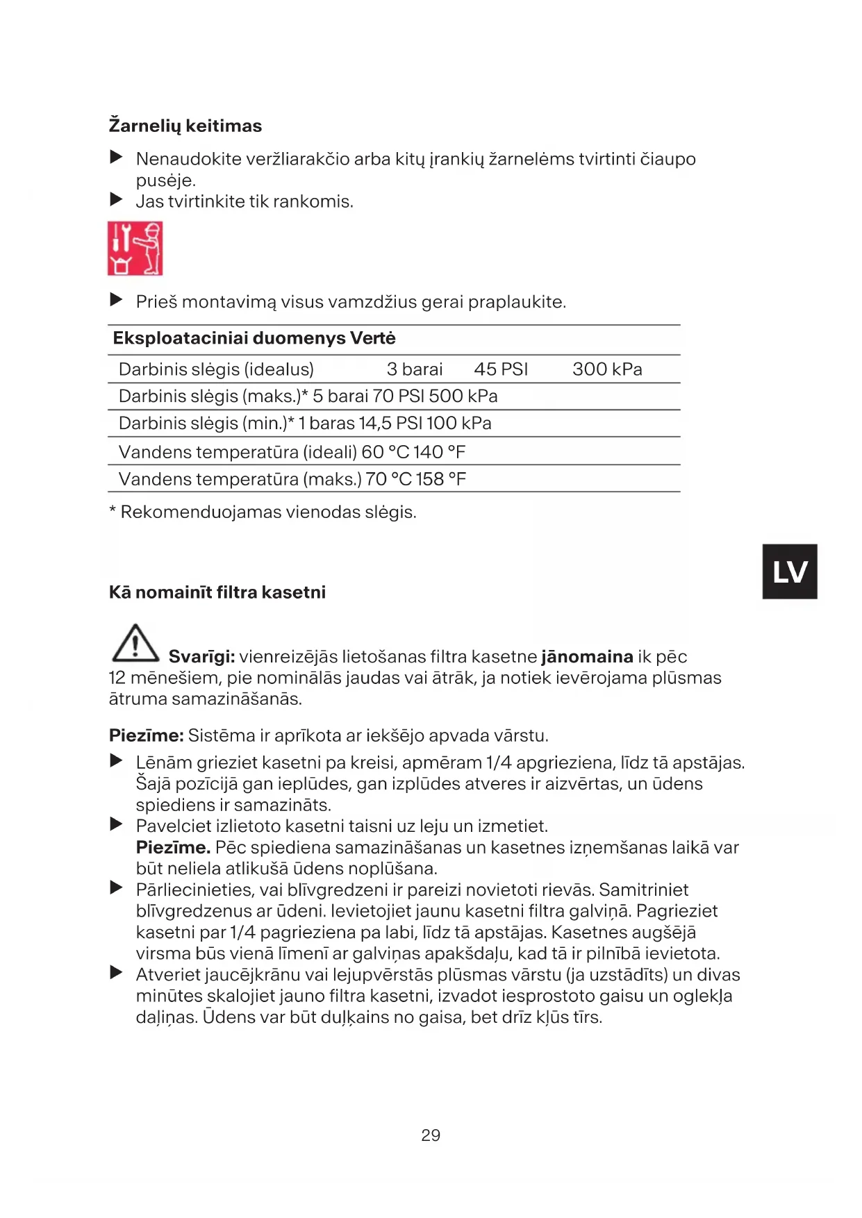 Pirms uzstādīšanas kārtīgi izskalojiet visas caurules. Tehniskie dati Vērtība Darbības spiediens (ideālais) 3bar 45PSI 300kPa Darbības spiediens (maks.)* 5bar 70PSI 500kPa Darbības spiediens (min.)* 1bar 14,5PSI 100kPa Ūdens temperatūra (ideālā) 60°C 140°F Ūdens temperatūra (maks.) 70°C 158°F