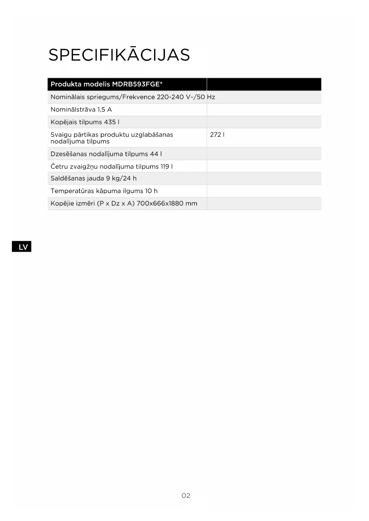 SPECIFIKĀCIJAS Produkta modelis MDRB593FGE* Nominālais spriegums/Frekvence 220-240 V~/50 Hz Nominālstrāva 1,5 A Kopējais tilpums 435 l Svaigu pārtikas produktu uzglabāšanas nodalījuma tilpums 272 l Dzesēšanas nodalījuma tilpums 44 l Četru zvaigžņu nodalījuma tilpums 119 l Saldēšanas jauda 9 kg/24 h Temperatūras kāpuma ilgums 10 h Kopējie izmēri (PxDzxA) 700x666x1880 mm03