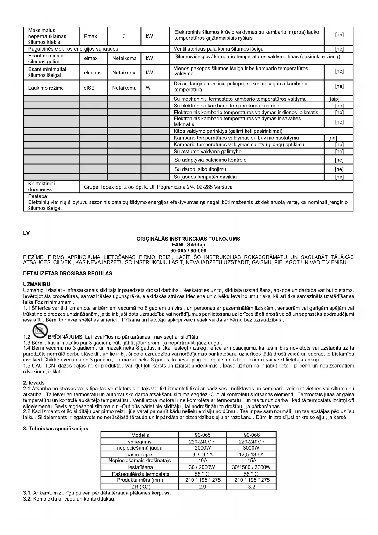 Modeļa identifikators (-i): 90-066 Lieta Simbols Vērtība Vienība Lieta Vienība Siltuma jauda Siltuma ievades veids tikai vietējiem telpu sildītājiem (izvēlieties vienu) Nominālā siltuma jauda Pnom 3 kW Manuāla siltuma uzlādes kontrole ar integrētu termostatu [Nē] Minimālā siltuma jauda (orientējoši) Pmin 1.5 kW Manuāla siltuma uzlādes kontrole ar atgriezenisko saiti telpas un / vai āra temperatūrā [Nē] Maksimālā nepārtrauktā siltuma jauda Pmax 3 kW Elektroniska siltuma uzlādes kontrole ar telpas un / vai āra temperatūras atgriezenisko saiti [Nē] Papildu elektrības patēriņš Ventilatora atbalstītā siltuma jauda [Nē]Pie nominālās siltuma jaudas elmax Nav kW Siltuma izvadīšanas veids / istabas temperatūras kontrole (izvēlieties vienu) Pie minimālās siltuma jaudas elmīns Nav kW Vienpakāpes siltuma jauda un nav istabas temperatūras kontroles [Nē] Gaidīšanas režīmā elSB Nav W Divas vai vairākas manuālas pakāpes, istabas temperatūras kontrole nav iespējama [Nē]