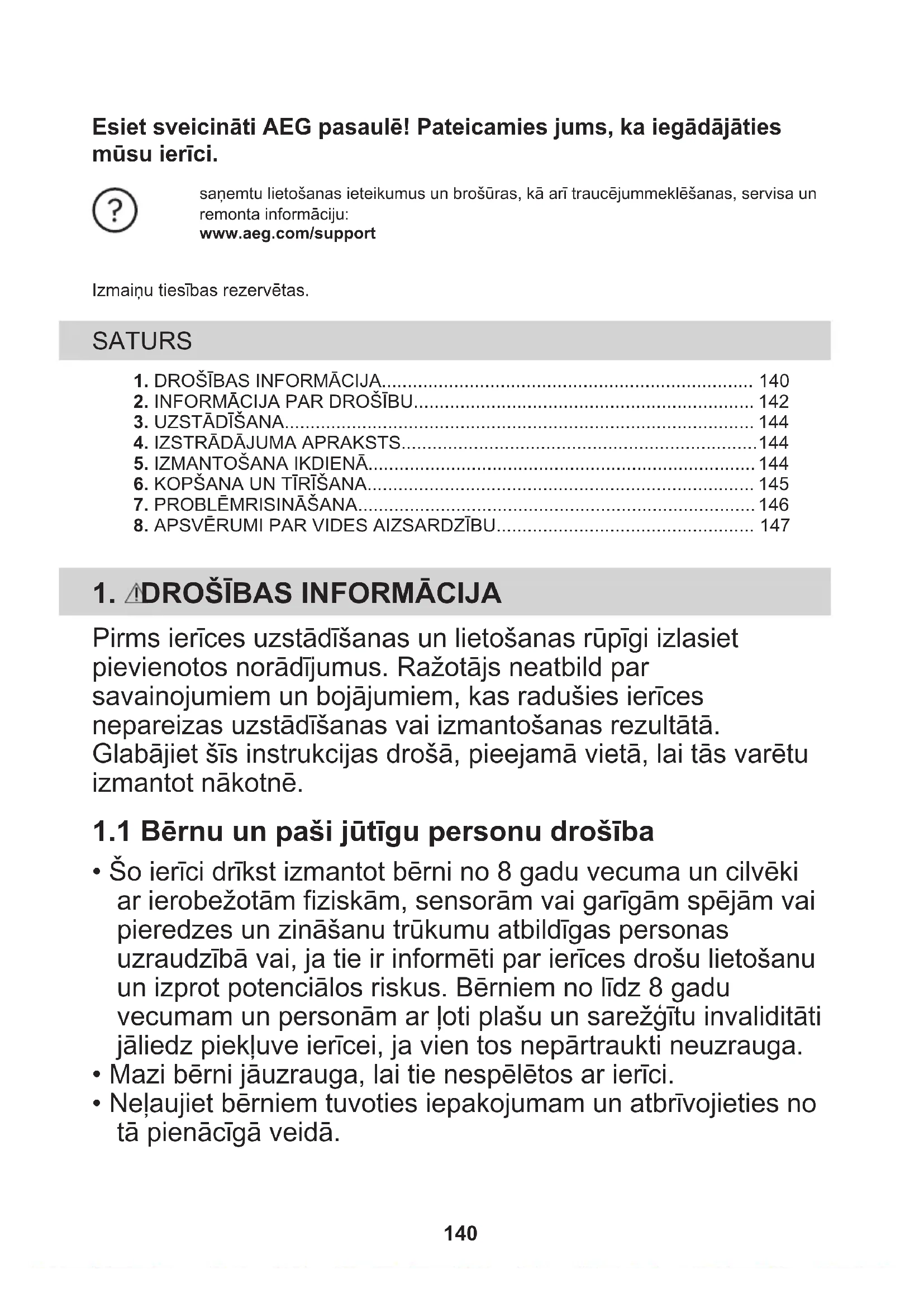- Šo ierīci drīkst izmantot bērni no 8 gadu vecuma un cilvēki ar ierobežotām fiziskām, sensorām vai garīgām spējām vai pieredzes un zināšanu trūkumu atbildīgas personas uzraudzībā vai, ja tie ir informēti par ierīces drošu lietošanu un izprot potenciālos riskus. Bērniem no līdz 8 gadu vecumam un personām ar ļoti plašu un sarežģītu invaliditāti jāliedz piekļuve ierīcei, ja vien tos nepārtraukti neuzrauga.
