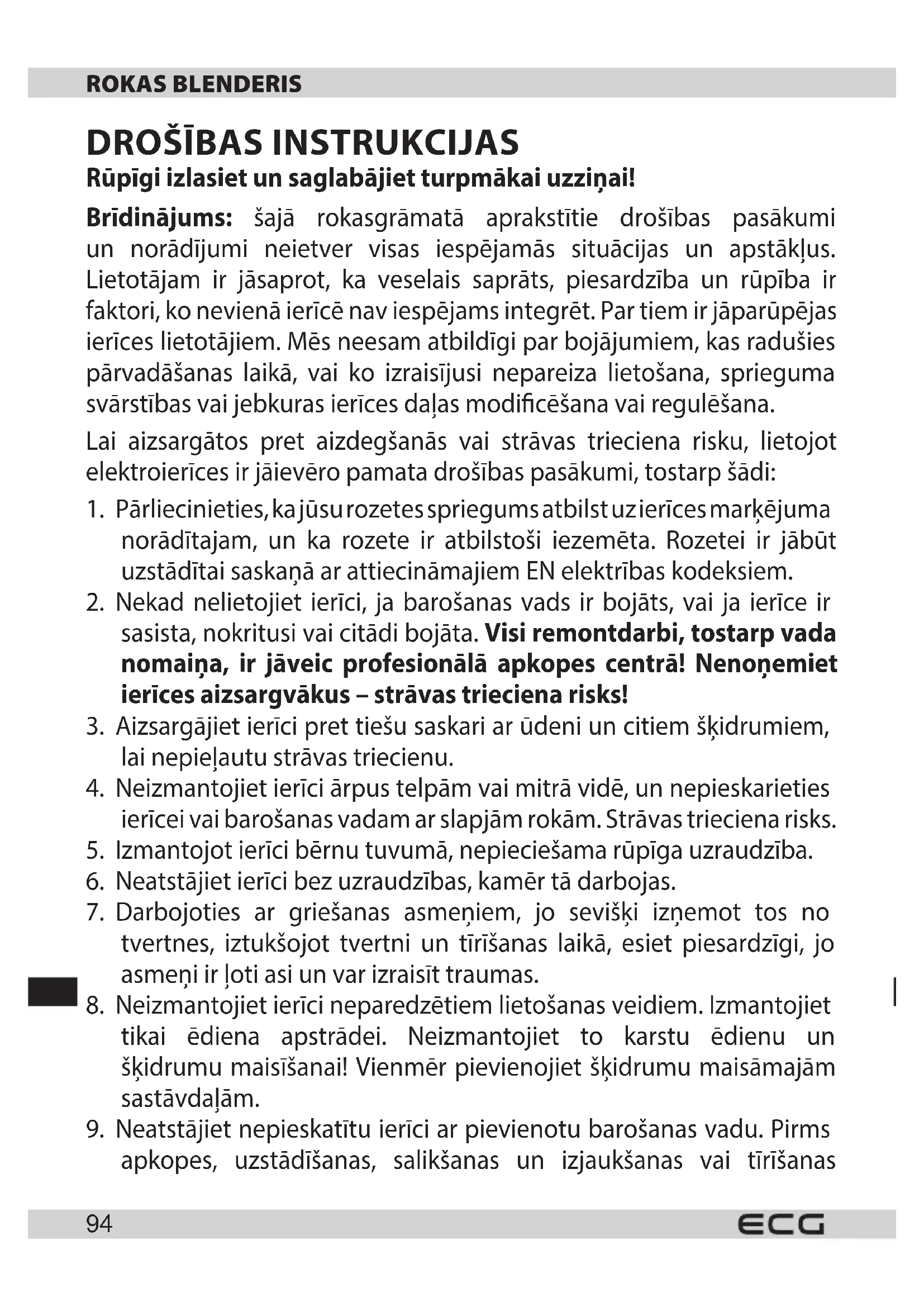 sasista, nokritusi vai citādi bojāta. Visi remontdarbi, tostarp vada nomaiņa, ir jāveic profesionālā apkopes centrā! Nenoņemiet ierīces aizsargvākus – strāvas trieciena risks!