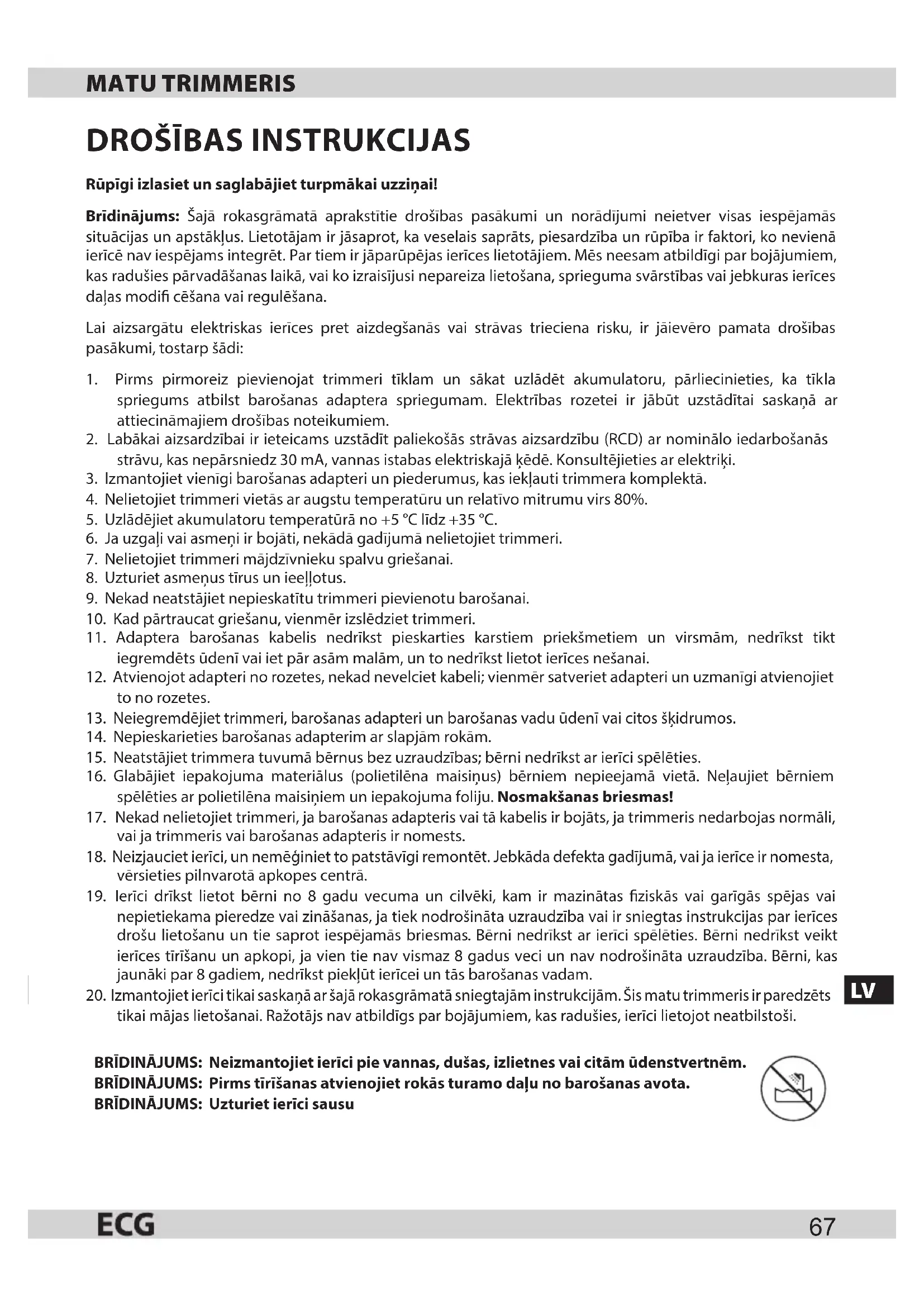Ietinamais papīrs un kartons – nogādāt pārstrādes punktā. Iepakojuma folija, PE maisi, plastmasas daļas – iemest plastmasas šķirošanas konteineros. ATBRĪVOŠANĀS NO IERĪCĒM KALPOŠANAS LAIKA BEIGĀS Atbrīvošanās no elektriska un elektroniska aprīkojuma (attiecas uz ES dalībvalstīm un citām Eiropas valstīm, kur ieviesta pārstrādes sistēma) Norādītais simbols uz ierīces vai iepakojuma nozīmē, ka ierīci nedrīkst pievienot sadzīves atkritumiem. Nododiet ierīci norādītajā elektriska un elektroniska aprīkojuma pārstrādes punktā. Novērsiet negatīvu ietekmi uz veselību un vidi, parūpējoties par ierīces pareizu pārstrādi. Pārstrāde palīdz taupīt dabas resursus. Lai saņemtu plašāku informāciju par šīs ierīces pārstrādi, sazinieties ar vietējo atbildīgo iestādi, sadzīves atkritumu apstrādes organizāciju vai veikalu, kur ierīci iegādājāties. Šajā ierīcē izmantoto NiMH akumulatoru nedrīkst izmest kopā ar sadzīves atkritumiem. No akumulatora ir jāatbrīvojas atbilstošā veidā. Lai saņemtu plašāku informāciju, lūdzu, sazinieties ar akumulatoru izplatītāju vai atkritumu savākšanas punktu. Šī ierīce atbilst ES direktīvu prasībām par elektromagnētisko saderību un elektrisko drošību. Pamācība ir pieejama vietnē www.ecg-electro.eu. Iespējamas teksta un tehnisko parametru izmaiņas. Ni-MhK