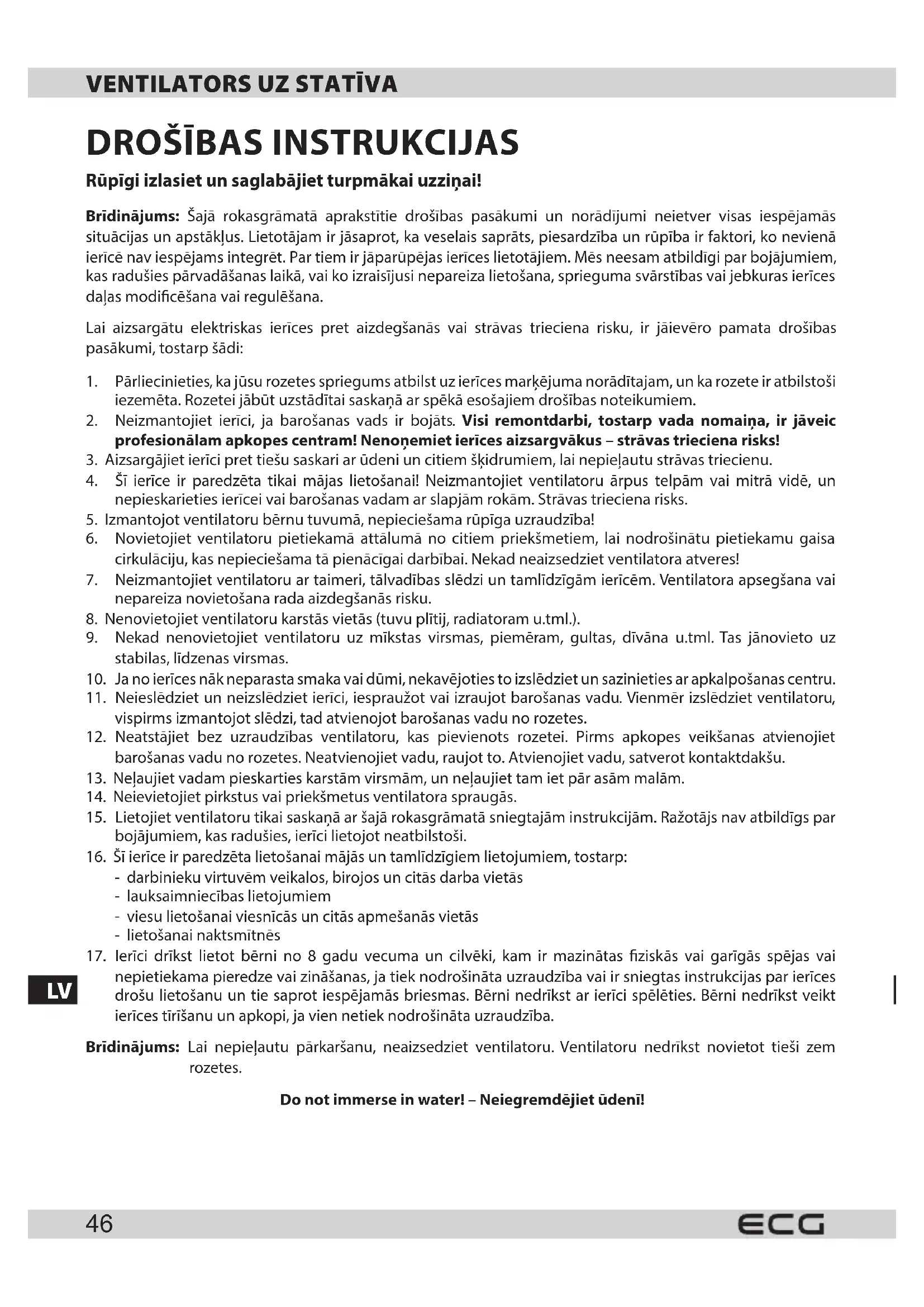 nepietiekama pieredze vai zināšanas, ja tiek nodrošināta uzraudzība vai ir sniegtas instrukcijas par ierīces drošu lietošanu un tie saprot iespējamās briesmas. Bērni nedrīkst ar ierīci spēlēties. Bērni nedrīkst veikt ierīces tīrīšanu un apkopi, ja vien netiek nodrošināta uzraudzība. Brīdinājums: Lai nepieļautu pārkaršanu, neaizsedziet ventilatoru. Ventilatoru nedrīkst novietot tieši zem rozetes. Do not immerse in water! – Neiegremdējiet ūdenī!LV