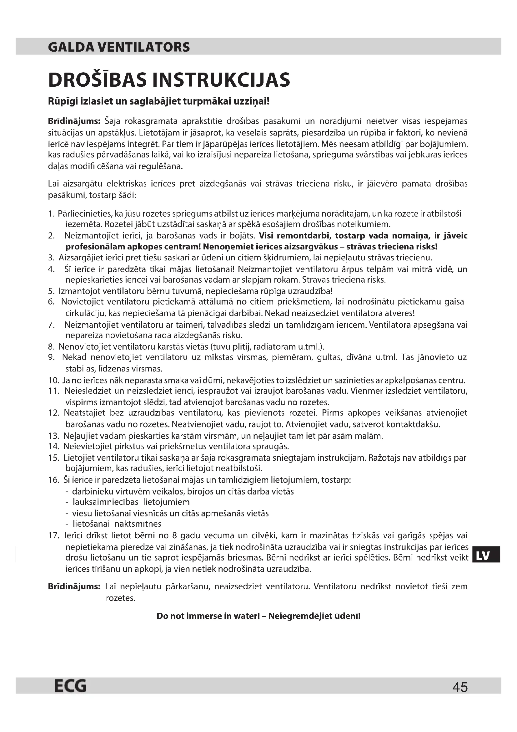 nepietiekama pieredze vai zināšanas, ja tiek nodrošināta uzraudzība vai ir sniegtas instrukcijas par ierīces drošu lietošanu un tie saprot iespējamās briesmas. Bērni nedrīkst ar ierīci spēlēties. Bērni nedrīkst veikt ierīces tīrīšanu un apkopi, ja vien netiek nodrošināta uzraudzība. Brīdinājums: Lai nepieļautu pārkaršanu, neaizsedziet ventilatoru. Ventilatoru nedrīkst novietot tieši zem rozetes. Do not immerse in water! – Neiegremdējiet ūdenī!LV