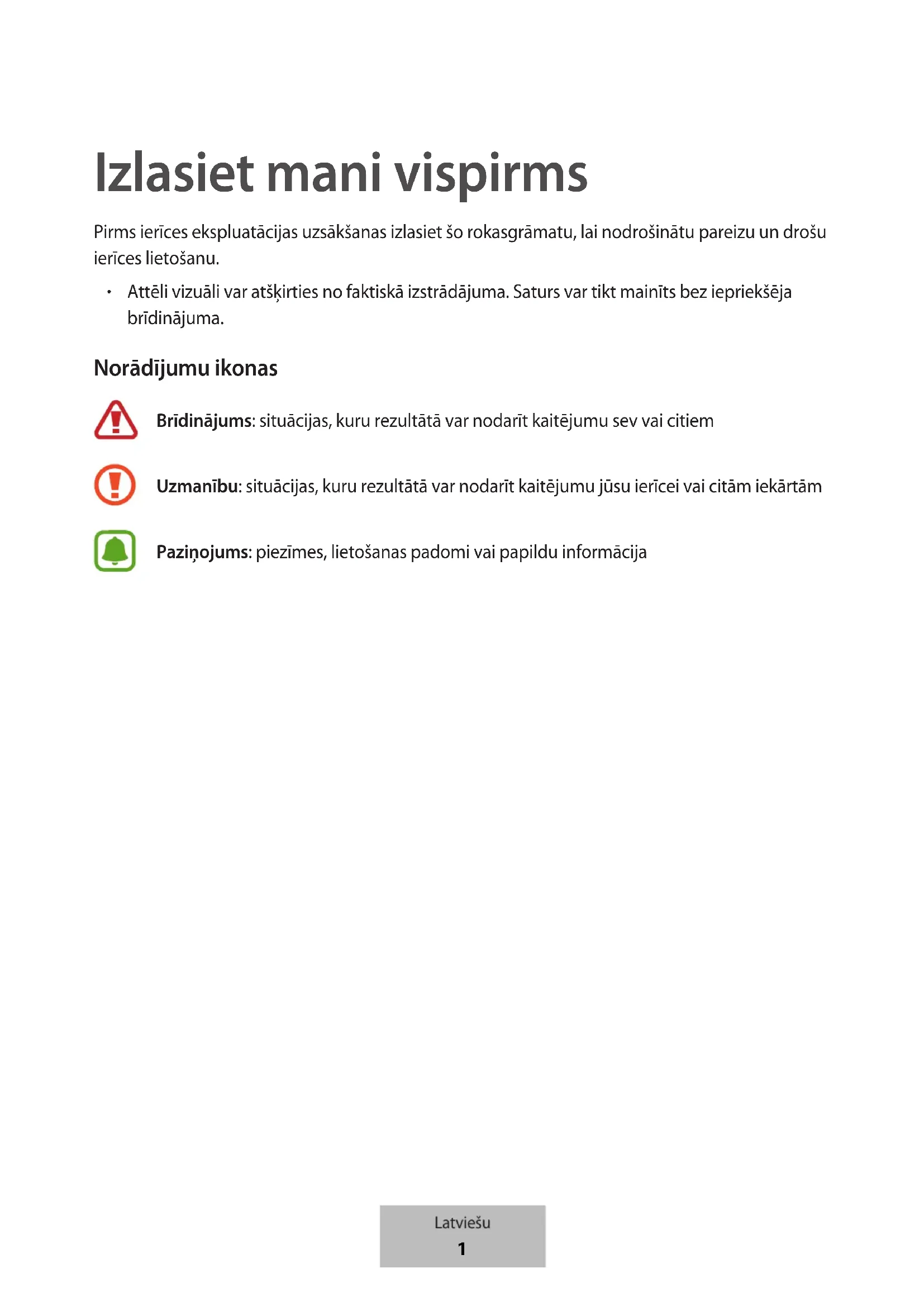 Attēli vizuāli var atšķirties no faktiskā izstrādājuma. Saturs var tikt mainīts bez iepriekšēja brīdinājuma. Norādījumu ikonas Brīdinājums: situācijas, kuru rezultātā var nodarīt kaitējumu sev vai citiem Uzmanību: situācijas, kuru rezultātā var nodarīt kaitējumu jūsu ierīcei vai citām iekārtām Paziņojums: piezīmes, lietošanas padomi vai papildu informācija Latviešu