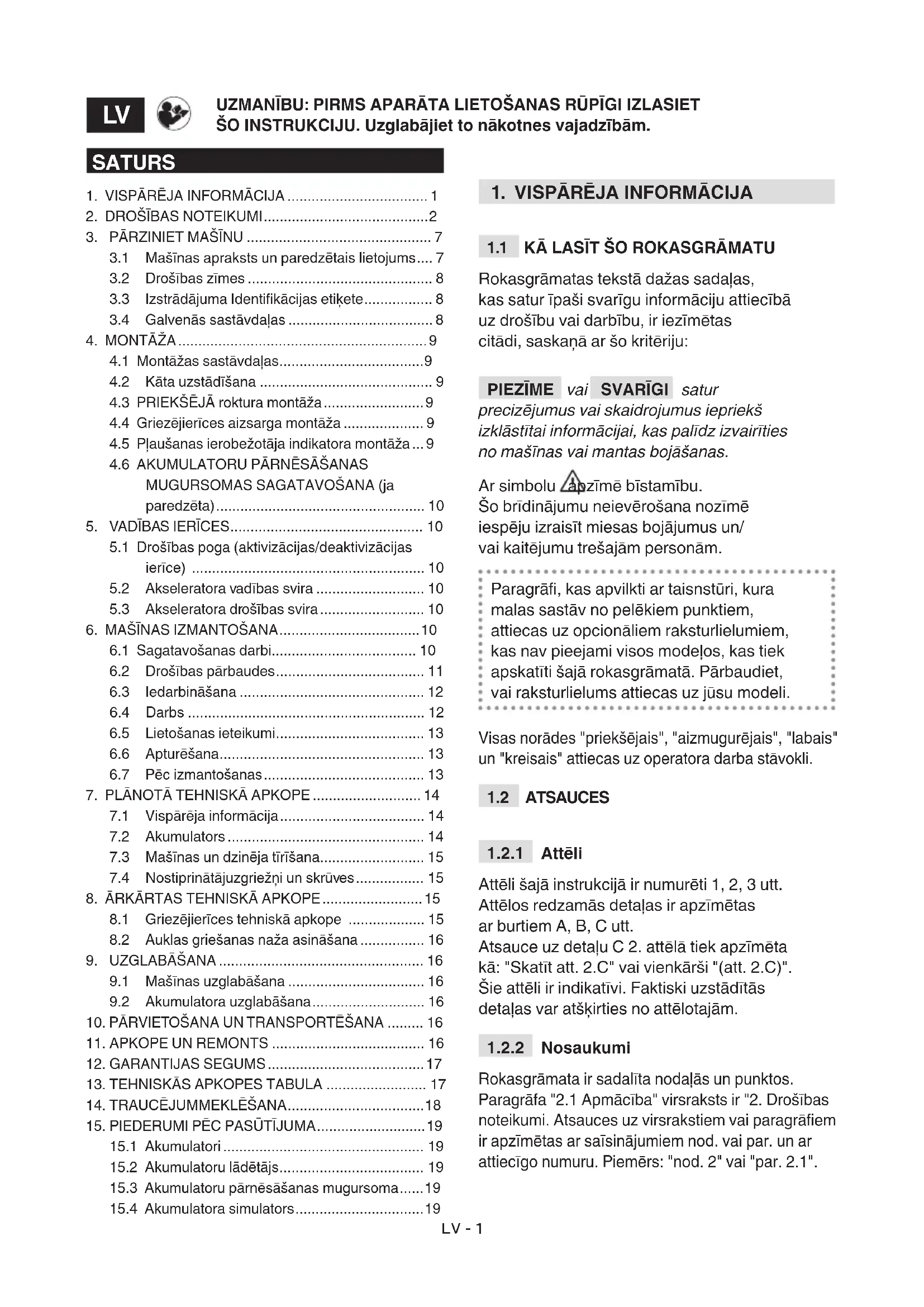 SVARĪGI Turpmāk izklāstītie drošības noteikumi ietver norādījumus, kuri ir ietverti attiecīgajā akumulatora un akumulatoru lādētāja rokasgrāmatā, kura ir pievienota mašīnai.