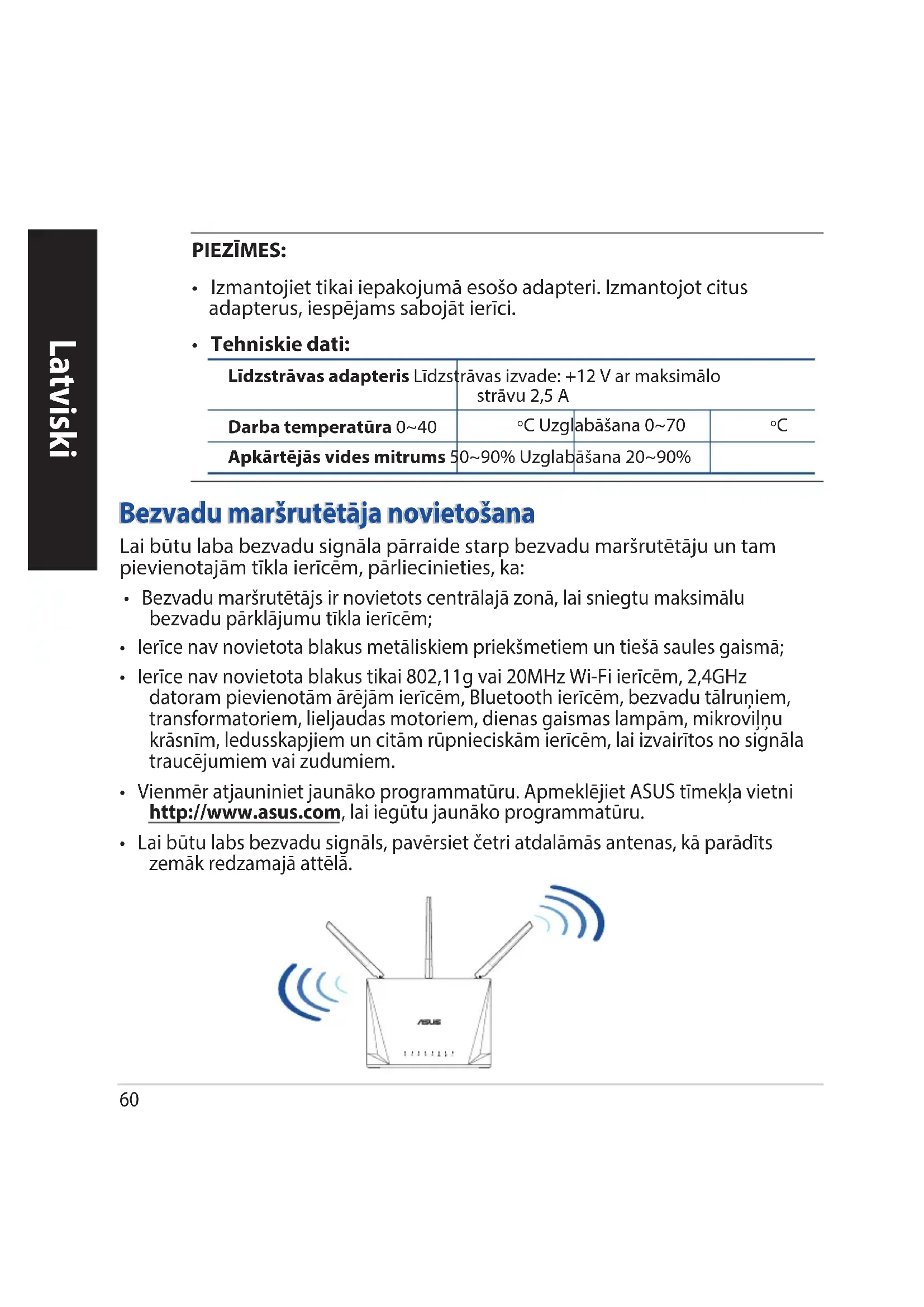 - Naudotojovadovągaliterastiinternete,adresuhttps://www.asus.com/support59 Latviski Īss apraksts Iepakojuma saturs RT-AC85P Maiņstrāvas adapteris Tīkla kabelis (RJ-45) Padomi ātrai darba uzsākšanai LAN 1~4 LEDs WPS poga WAN LED Strāvas (DC-IN) osta 2,4GHz LED Strāvas poga 5GHz LED USB 3.0 osta Barošanas LED WAN (Internet) osta Atiestatīšanas poga LAN 1~4 ostām60 Latviski Bezvadu maršrutētāja novietošana Lai būtu laba bezvadu signāla pārraide starp bezvadu maršrutētāju un tam pievienotajām tīkla ierīcēm, pārliecinieties, ka: