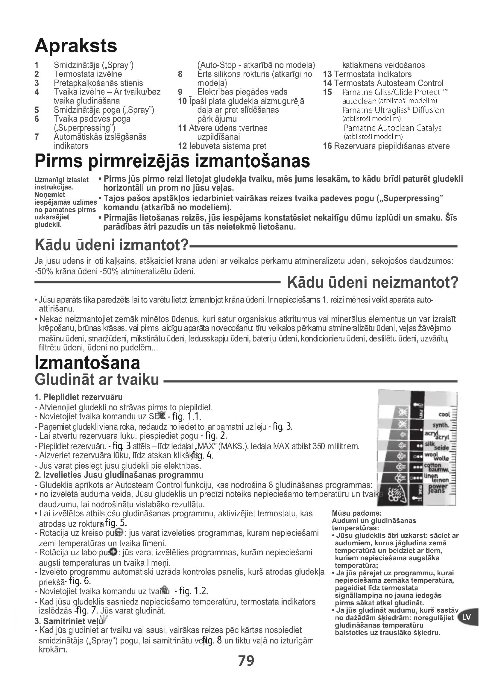 - fig. 1.1. - Paņemiet gludekli vienā rokā, nedaudz nolieciet to, ar pamatni uz leju - fig. 3. - Lai atvērtu rezervuāra lūku, piespiediet pogu - fig. 2. - Piepildiet rezervuāru - fig. 3 attēls – līdz iedaļai „MAX” (MAKS.). Iedaļa MAX atbilst 350 mililitriem. - Aizveriet rezervuāra lūku, līdz atskan klikšķis - fig. 4. - Jūs varat pieslēgt jūsu gludekli pie elektrības.2. Izvēlieties Jūsu gludināšanas programmu - Gludeklis aprīkots ar Autosteam Control funkciju, kas nodrošina 8 gludināšanas programmas:• no izvēlētā auduma veida, Jūsu gludeklis un precīzi noteiks nepieciešamo temperatūru un tvaikadaudzumu, lai nodrošinātu vislabāko rezultātu.• Lai izvēlētos atbilstošu gludināšanas programmu, aktivizējiet termostatu, kasatrodas uz roktura - fig. 5. - Rotācija uz kreiso pusi : jūs varat izvēlēties programmas, kurām nepieciešamizemi temperatūras un tvaika līmeņi. - Rotācija uz labo pusi : jūs varat izvēlēties programmas, kurām nepieciešamiaugsti temperatūras un tvaika līmeņi. - Izvēlēto programmu automātiski uzrāda kontroles panelis, kurš atrodas gludekļapriekšā - fig. 6. - Novietojiet tvaika komandu uz tvaiku - fig. 1.2.- Kad jūsu gludeklis sasniedz nepieciešamo temperatūru, termostata indikatorsizslēdzās - fig. 7. Jūs varat gludināt. 3. Samitriniet veļu - Kad jūs gludiniet ar tvaiku vai sausi, vairākas reizes pēc kārtas nospiedietsmidzinātāja („Spray”) pogu, lai samitrinātu veļu - fig. 8 un tiktu vaļā no izturīgām krokām.Uzmanīgi izlasietinstrukcijas.Noņemietiespējamās uzlīmesno pamatnes pirmsuzkarsējietgludekli.Mūsu padoms: Audumi un gludināšanastemperatūras:• Jūsu gludeklis ātri uzkarst: sāciet araudumiem, kurus jāgludina zemātemperatūrā un beidziet ar tiem,kuriem nepieciešama augstākatemperatūra;• Ja jūs pārejat uz programmu, kurainepieciešama zemāka temperatūra,pagaidiet līdz termostatasignāllampiņa no jauna iedegāspirms sākat atkal gludināt.• Ja jūs gludināt audumu, kurš sastāvno dažādām šķiedrām: noregulējietgludināšanas temperatūrubalstoties uz trauslāko šķiedru. Apraksts