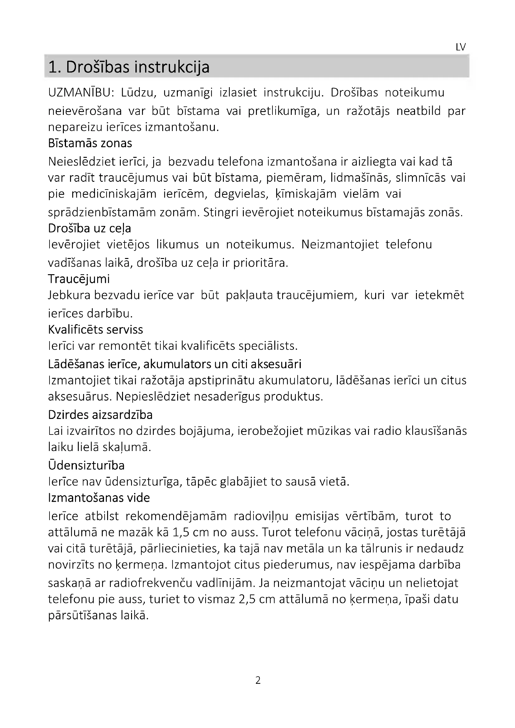 UZMANĪBU: Lūdzu, uzmanīgi izlasiet instrukciju. Drošības noteikumu neievērošana var būt bīstama vai pretlikumīga, un ražotājs neatbild par nepareizu ierīces izmantošanu. Bīstamās zonas Neieslēdziet ierīci, ja bezvadu telefona izmantošana ir aizliegta vai kad tā var radīt traucējumus vai būt bīstama, piemēram, lidmašīnās, slimnīcās vai pie medicīniskajām ierīcēm, degvielas, ķīmiskajām vielām vai sprādzienbīstamām zonām. Stingri ievērojiet noteikumus bīstamajās zonās. Drošība uz ceļa Ievērojiet vietējos likumus un noteikumus. Neizmantojiet telefonu vadīšanas laikā, drošība uz ceļa ir prioritāra. Traucējumi Jebkura bezvadu ierīce var būt pakļauta traucējumiem, kuri var ietekmēt ierīces darbību. Kvalificēts serviss Ierīci var remontēt tikai kvalificēts speciālists. Lādēšanas ierīce, akumulators un citi aksesuāri Izmantojiet tikai ražotāja apstiprinātu akumulatoru, lādēšanas ierīci un citus aksesuārus. Nepieslēdziet nesaderīgus produktus. Dzirdes aizsardzība Lai izvairītos no dzirdes bojājuma, ierobežojiet mūzikas vai radio klausīšanās laiku lielā skaļumā. Ūdensizturība Ierīce nav ūdensizturīga, tāpēc glabājiet to sausā vietā. Izmantošanas vide Ierīce atbilst rekomendējamām radioviļņu emisijas vērtībām, turot to attālumā ne mazāk kā 1,5 cm no auss. Turot telefonu vāciņā, jostas turētājā vai citā turētājā, pārliecinieties, ka tajā nav metāla un ka tālrunis ir nedaudz novirzīts no ķermeņa. Izmantojot citus piederumus, nav iespējama darbība saskaņā ar radiofrekvenču vadlīnijām. Ja neizmantojat vāciņu un nelietojat telefonu pie auss, turiet to vismaz 2,5 cm attālumā no ķermeņa, īpaši datu pārsūtīšanas laikā.LV