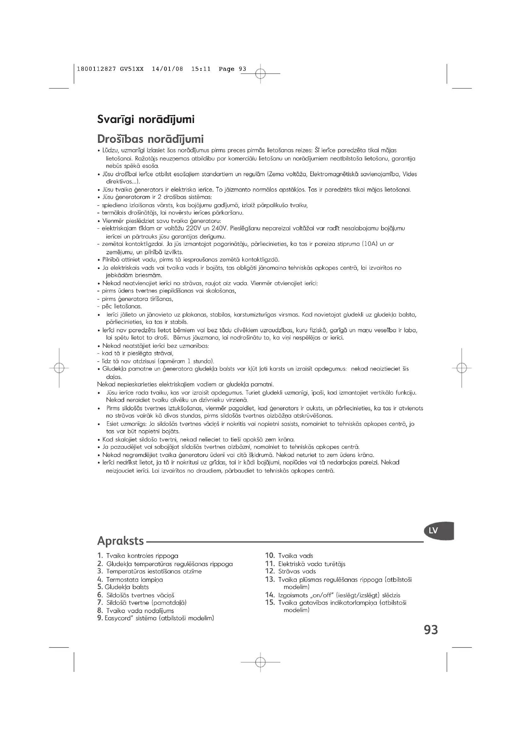 - Lūdzu, uzmanīgi izlasiet šos norādījumus pirms preces pirmās lietošanas reizes: Šī ierīce paredzēta tikai mājaslietošanai. Ražotājs neuzņemas atbildību par komerciālu lietošanu un norādījumiem neatbilstoša lietošanu, garantijanebūs spēkā esoša.• Jūsu drošībai ierīce atbilst esošajiem standartiem un regulām (Zema voltāža, Elektromagnētiskā savienojamība, Videsdirektīvas...).• Jūsu tvaika ģenerators ir elektriska ierīce. To jāizmanto normālos apstākļos. Tas ir paredzēts tikai mājas lietošanai.• Jūsu ģeneratoram ir 2 drošības sistēmas: - spiediena izlaišanas vārsts, kas bojājumu gadījumā, izlaiž pārpalikušo tvaiku, - termālais drošinātājs, lai novērstu ierīces pārkaršanu.• Vienmēr pieslēdziet savu tvaika ģeneratoru: - elektriskajam tīklam ar voltāžu 220V un 240V. Pieslēgšanu nepareizai voltāžai var radīt nesalabojamu bojājumuierīcei un pārtrauks jūsu garantijas derīgumu. - zemētai kontaktligzdai. Ja jūs izmantojat pagarinātāju, pārliecinieties, ka tas ir pareiza stipruma (10A) un arzemējumu, un pilnībā izvilkts. • Pilnībā attiniet vadu, pirms tā iespraušanas zemētā kontaktligzdā.• Ja elektriskais vads vai tvaika vads ir bojāts, tas obligāti jānomaina tehniskās apkopes centrā, lai izvairītos nojebkādām briesmām. • Nekad neatvienojiet ierīci no strāvas, raujot aiz vada. Vienmēr atvienojiet ierīci: - pirms ūdens tvertnes piepildīšanas vai skalošanas, - pirms ģeneratora tīrīšanas, - pēc lietošanas.