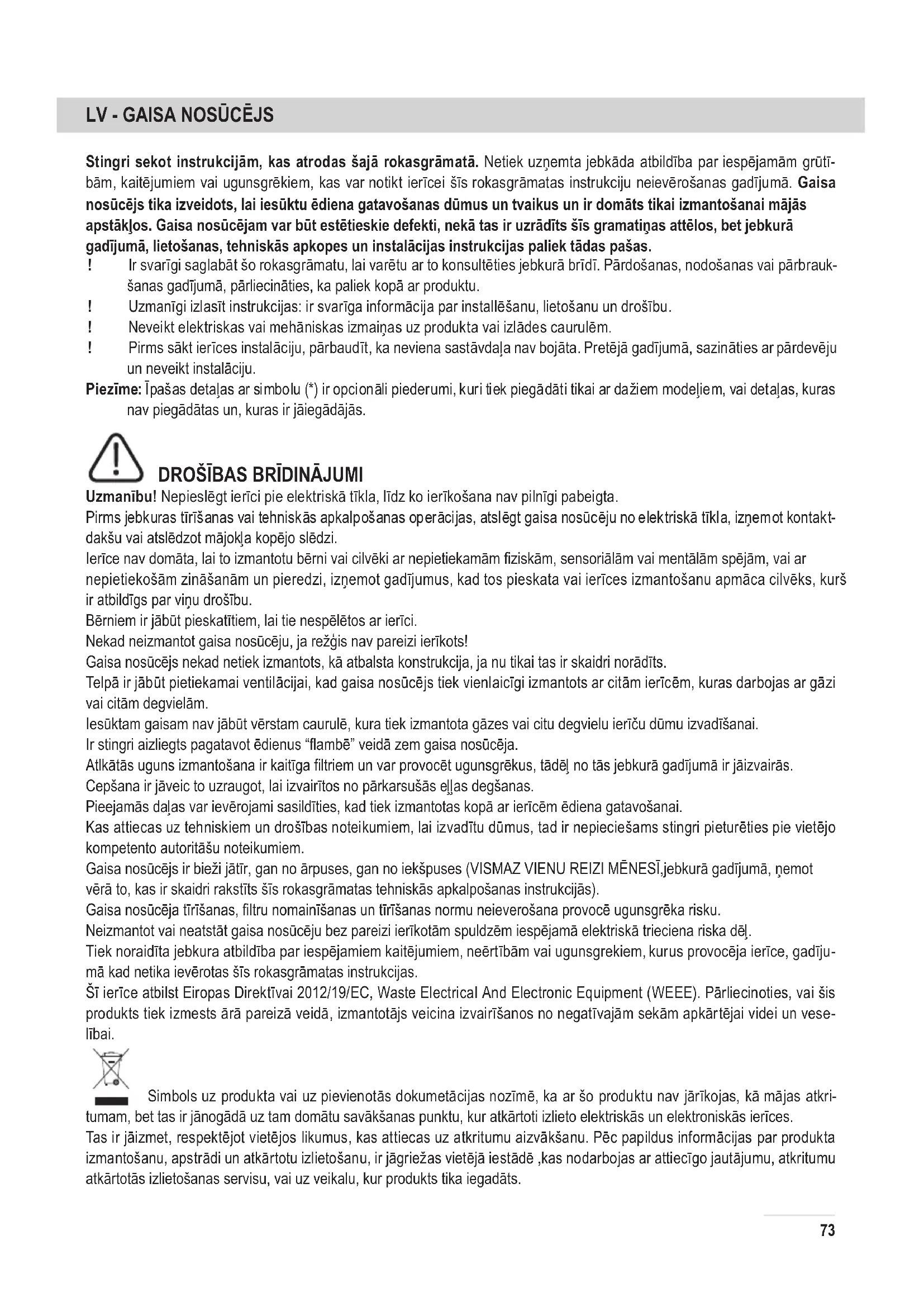 Uzmanību! Nepieslēgt ierīci pie elektriskā tīkla, līdz ko ierīkošana nav pilnīgi pabeigta. Pirms jebkuras tīrīšanas vai tehniskās apkalpošanas operācijas, atslēgt gaisa nosūcēju no elektriskā tīkla, izņemot kontakt- dakšu vai atslēdzot mājokļa kopējo slēdzi. Ierīce nav domāta, lai to izmantotu bērni vai cilvēki ar nepietiekamām ziskām, sensoriālām vai mentālām spējām, vai ar nepietiekošām zināšanām un pieredzi, izņemot gadījumus, kad tos pieskata vai ierīces izmantošanu apmāca cilvēks, kurš ir atbildīgs par viņu drošību. Bērniem ir jābūt pieskatītiem, lai tie nespēlētos ar ierīci. Nekad neizmantot gaisa nosūcēju, ja režģis nav pareizi ierīkots! Gaisa nosūcējs nekad netiek izmantots, kā atbalsta konstrukcija, ja nu tikai tas ir skaidri norādīts. Telpā ir jābūt pietiekamai ventilācijai, kad gaisa nosūcējs tiek vienlaicīgi izmantots ar citām ierīcēm, kuras darbojas ar gāzi vai citām degvielām. Iesūktam gaisam nav jābūt vērstam caurulē, kura tiek izmantota gāzes vai citu degvielu ierīču dūmu izvadīšanai. Ir stingri aizliegts pagatavot ēdienus “ambē” veidā zem gaisa nosūcēja. Atlkātās uguns izmantošana ir kaitīga ltriem un var provocēt ugunsgrēkus, tādēļ no tās jebkurā gadījumā ir jāizvairās. Cepšana ir jāveic to uzraugot, lai izvairītos no pārkarsušās eļļas degšanas. Pieejamās daļas var ievērojami sasildīties, kad tiek izmantotas kopā ar ierīcēm ēdiena gatavošanai. Kas attiecas uz tehniskiem un drošības noteikumiem, lai izvadītu dūmus, tad ir nepieciešams stingri pieturēties pie vietējo kompetento autoritāšu noteikumiem. Gaisa nosūcējs ir bieži jātīr, gan no ārpuses, gan no iekšpuses (VISMAZ VIENU REIZI MĒNESĪ,jebkurā gadījumā, ņemot vērā to, kas ir skaidri rakstīts šīs rokasgrāmatas tehniskās apkalpošanas instrukcijās). Gaisa nosūcēja tīrīšanas, ltru nomainīšanas un tīrīšanas normu neieverošana provocē ugunsgrēka risku. Neizmantot vai neatstāt gaisa nosūcēju bez pareizi ierīkotām spuldzēm iespējamā elektriskā trieciena riska dēļ. Tiek noraidīta jebkura atbildība par iespējamiem kaitējumiem, neērtībām vai ugunsgrekiem, kurus provocēja ierīce, gadīju- mā kad netika ievērotas šīs rokasgrāmatas instrukcijas. Šī ierīce atbilst Eiropas Direktīvai 2012/19/EC, Waste Electrical And Electronic Equipment (WEEE). Pārliecinoties, vai šis produkts tiek izmests ārā pareizā veidā, izmantotājs veicina izvairīšanos no negatīvajām sekām apkārtējai videi un vese- lībai. Simbols uz produkta vai uz pievienotās dokumetācijas nozīmē, ka ar šo produktu nav jārīkojas, kā mājas atkri- tumam, bet tas ir jānogādā uz tam domātu savākšanas punktu, kur atkārtoti izlieto elektriskās un elektroniskās ierīces. Tas ir jāizmet, respektējot vietējos likumus, kas attiecas uz atkritumu aizvākšanu. Pēc papildus informācijas par produkta izmantošanu, apstrādi un atkārtotu izlietošanu, ir jāgriežas vietējā iestādē ,kas nodarbojas ar attiecīgo jautājumu, atkritumu atkārtotās izlietošanas servisu, vai uz veikalu, kur produkts tika iegadāts.74 Ierīce ir izstrādāta, pārbaudīta un ražota atbilstoši šādām prasībām.