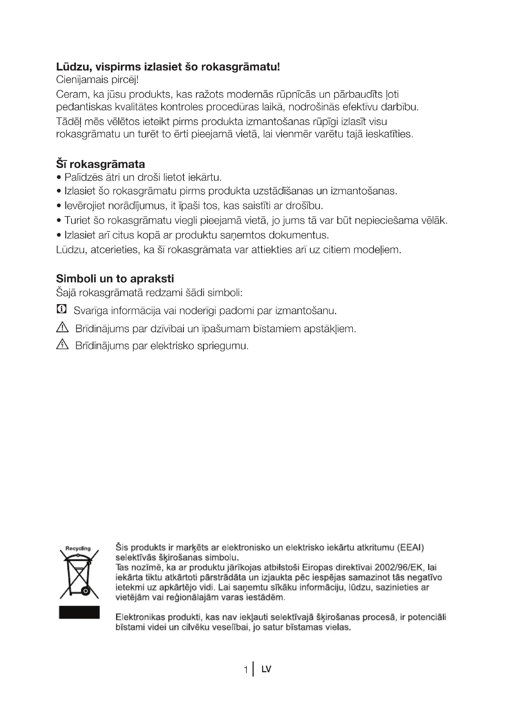 Lūdzu, vispirms izlasiet šo rokasgrāmatu! Cienījamais pircēj! Ceram, ka jūsu produkts, kas ražots modernās rūpnīcās un pārbaudīts ļoti pedantiskas kvalitātes kontroles procedūras laikā, nodrošinās efektīvu darbību. Tādēļ mēs vēlētos ieteikt pirms produkta izmantošanas rūpīgi izlasīt visu rokasgrāmatu un turēt to ērti pieejamā vietā, lai vienmēr varētu tajā ieskatīties. Šī rokasgrāmata