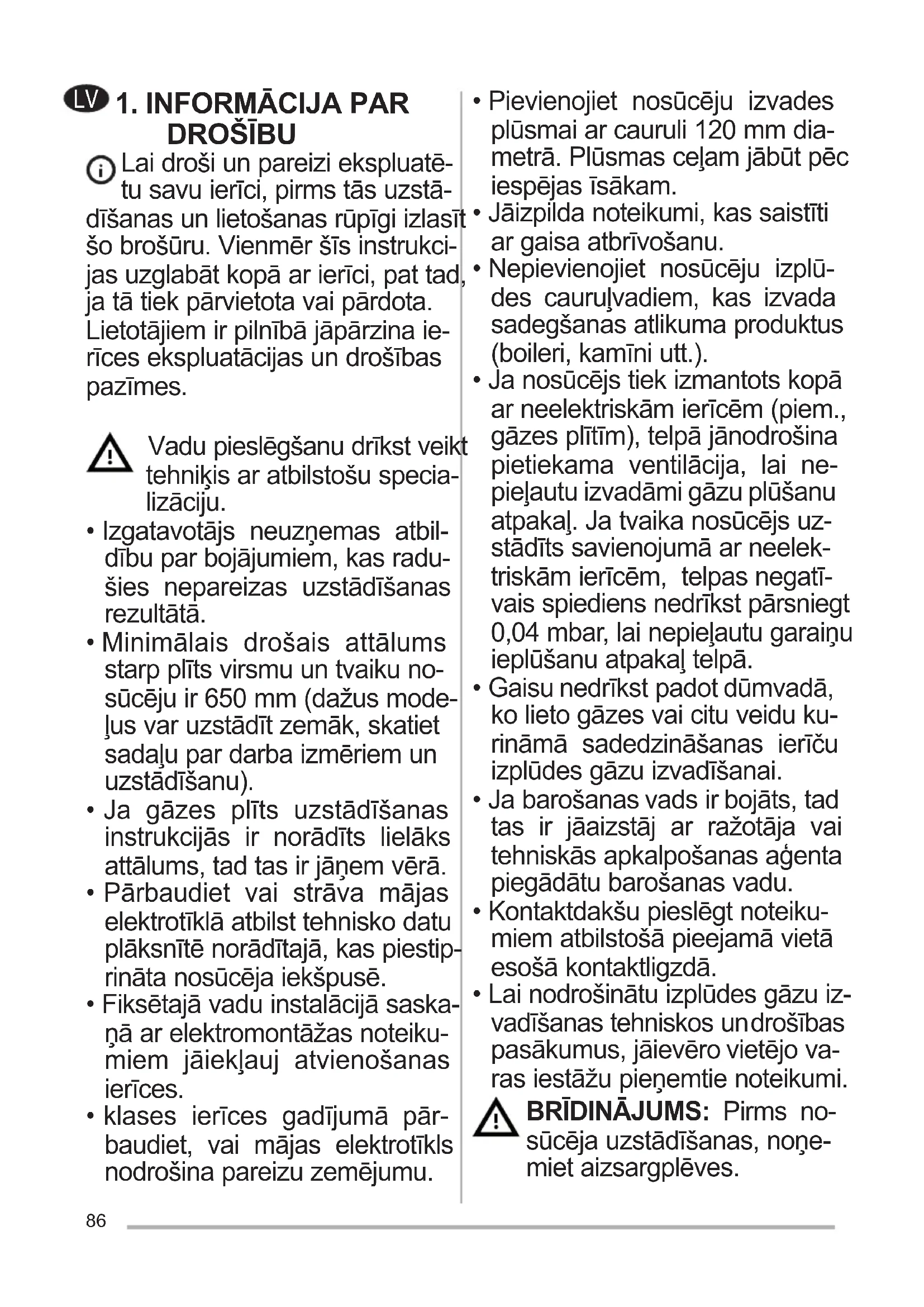 - Lai nodrošinātu izplūdes gāzu iz- vadīšanas tehniskos un drošības pasākumus, jāievēro vietējo va- ras iestāžu pieņemtie noteikumi. BRĪDINĀJUMS: Pirms no- sūcēja uzstādīšanas, noņe- miet aizsargplēves.87