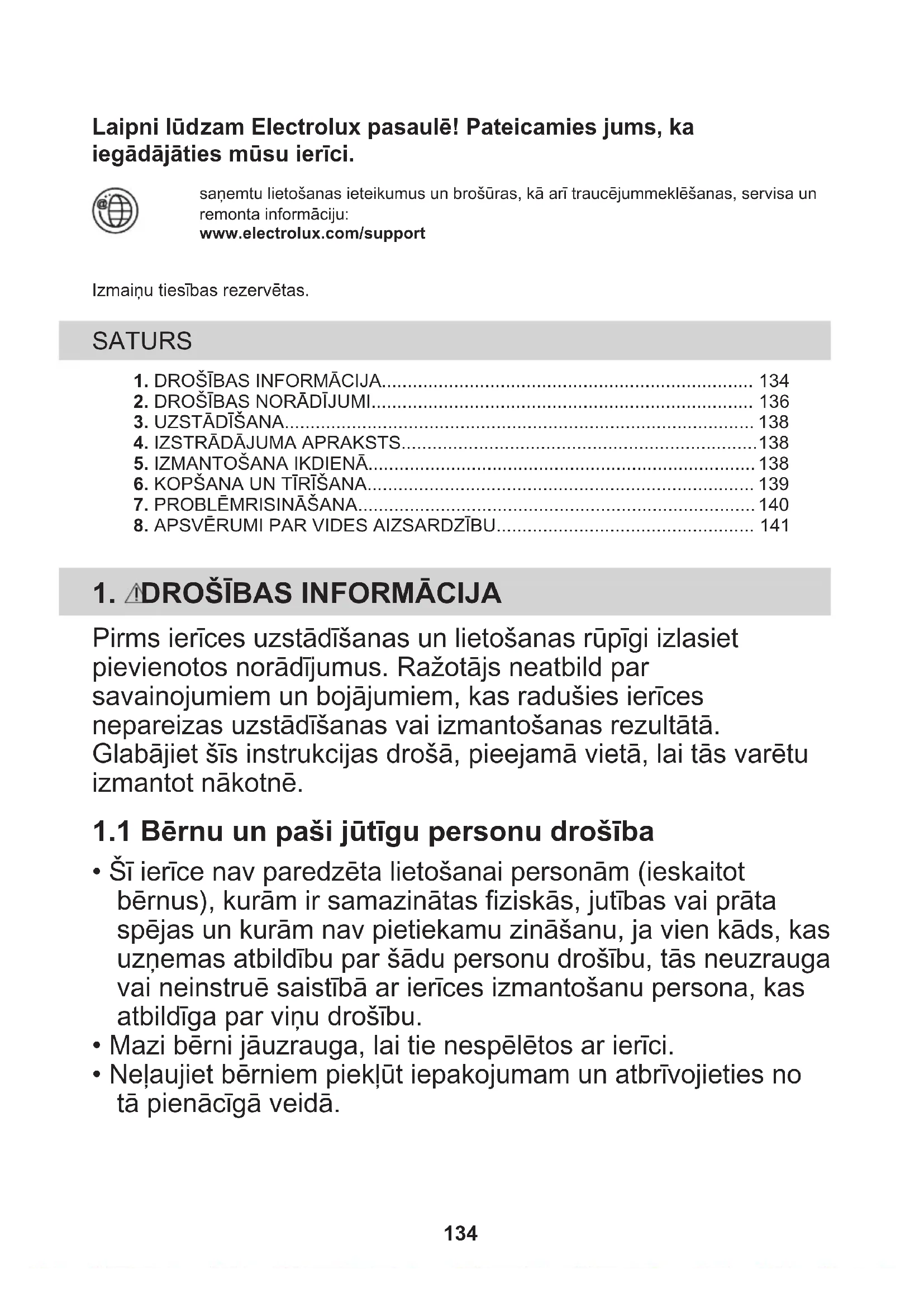 - Neļaujiet bērniem piekļūt iepakojumam un atbrīvojieties no tā pienācīgā veidā. 134• Neļaujiet bērniem un mājdzīvniekiem atrasties ierīces tuvumā, kad tā darbojas.