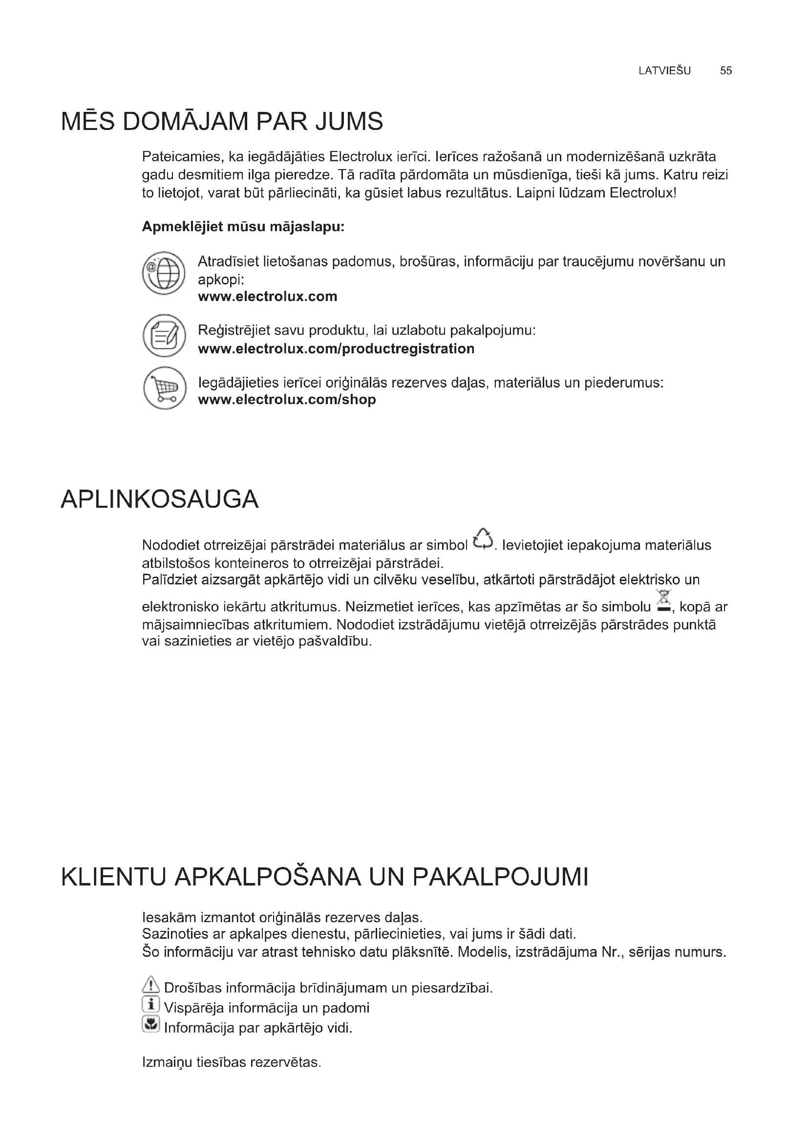 Iesakām izmantot oriģinālās rezerves daļas. Sazinoties ar apkalpes dienestu, pārliecinieties, vai jums ir šādi dati. Šo informāciju var atrast tehnisko datu plāksnītē. Modelis, izstrādājuma Nr., sērijas numurs. Drošības informācija brīdinājumam un piesardzībai. Vispārēja informācija un padomi Informācija par apkārtējo vidi. Izmaiņu tiesības rezervētas. LV LIETOŠANAS PAMĀCĪBAwww.electrolux.com