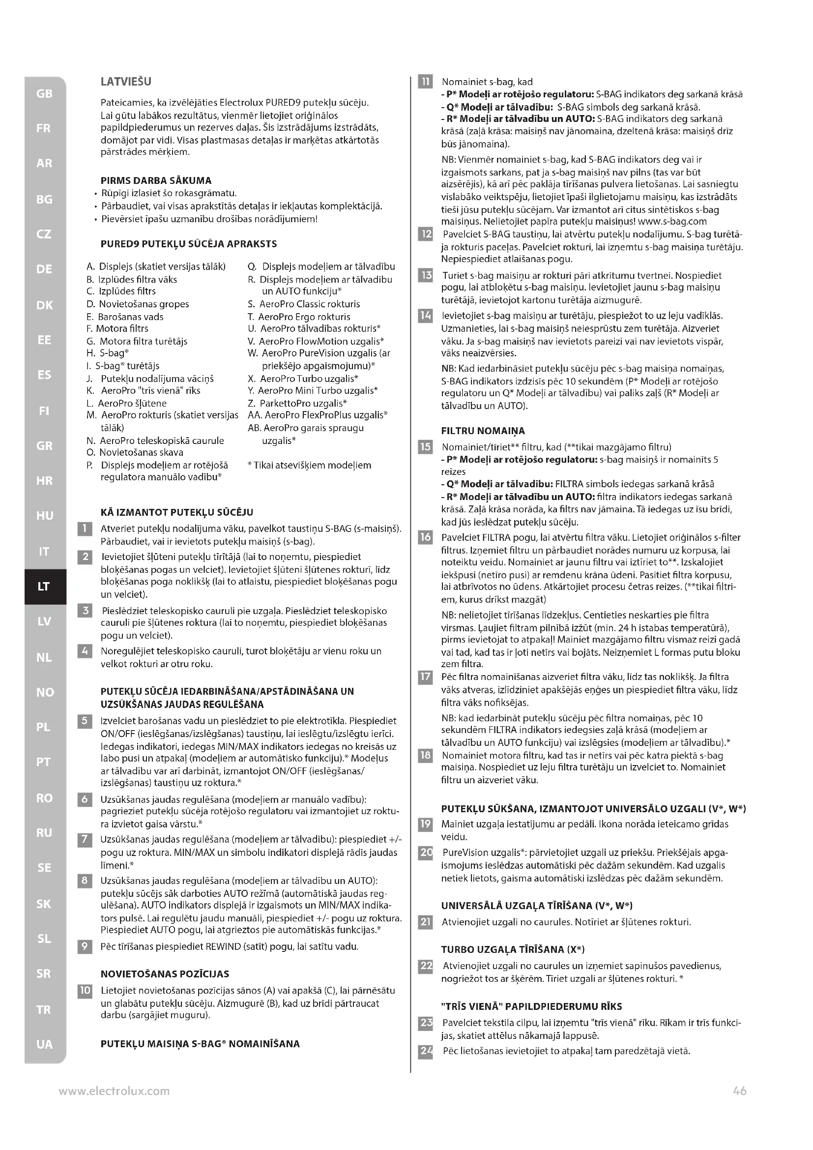 11 Nomainiet s-bag, kad - P* Modei ar rotējošo regulatoru: S-BAG indikators deg sarkanā krāsā - Q* Modei ar tālvadību: S-BAG simbols deg sarkanā krāsā. - R* Modei ar tālvadību un AUTO: S-BAG indikators deg sarkanā krāsā (zaļā krāsa: maisiņš nav jānomaina, dzeltenā krāsa: maisiņš drīz būs jānomaina). NB: Vienmēr nomainiet s-bag, kad S-BAG indikators deg vai ir izgaismots sarkans, pat ja s-bag maisiņš nav pilns (tas var būt aizsērējis), kā arī pēc paklāja tīrīšanas pulvera lietošanas. Lai sasniegtu vislabāko veiktspēju, lietojiet īpaši ilglietojamu maisiņu, kas izstrādāts tieši jūsu putekļu sūcējam. Var izmantot arī citus sintētiskos s-bag maisiņus. Nelietojiet papīra putekļu maisiņus! www.s-bag.com 12 Pavelciet S-BAG taustiņu, lai atvērtu putekļu nodalījumu. S-bag turētā- ja rokturis paceļas. Pavelciet rokturi, lai izņemtu s-bag maisiņa turētāju. Nepiespiediet atlaišanas pogu. 13 Turiet s-bag maisiņu ar rokturi pāri atkritumu tvertnei. Nospiediet pogu, lai atbloķētu s-bag maisiņu. Ievietojiet jaunu s-bag maisiņu turētājā, ievietojot kartonu turētāja aizmugurē. 14 Ievietojiet s-bag maisiņu ar turētāju, piespiežot to uz leju vadīklās. Uzmanieties, lai s-bag maisiņš neiesprūstu zem turētāja. Aizveriet vāku. Ja s-bag maisiņš nav ievietots pareizi vai nav ievietots vispār, vāks neaizvērsies. NB: Kad iedarbināsiet putekļu sūcēju pēc s-bag maisiņa nomaiņas, S-BAG indikators izdzisīs pēc 10 sekundēm (P* Modeļi ar rotējošo regulatoru un Q* Modeļi ar tālvadību) vai paliks zaļš (R* Modeļi ar tālvadību un AUTO). FILTRU NOMAIA 15 Nomainiet/tīriet** ltru, kad (**tikai mazgājamo ltru) - P* Modei ar rotējošo regulatoru: s-bag maisiņš ir nomainīts 5 reizes - Q* Modei ar tālvadību: FILTRA simbols iedegas sarkanā krāsā - R* Modei ar tālvadību un AUTO: ltra indikators iedegas sarkanā krāsā. Zaļā krāsa norāda, ka ltrs nav jāmaina. Tā iedegas uz īsu brīdi, kad jūs ieslēdzat putekļu sūcēju. 16 Pavelciet FILTRA pogu, lai atvērtu ltra vāku. Lietojiet oriģinālos s-lter ltrus. Izņemiet ltru un pārbaudiet norādes numuru uz korpusa, lai noteiktu veidu. Nomainiet ar jaunu ltru vai iztīriet to**. Izskalojiet iekšpusi (netīro pusi) ar remdenu krāna ūdeni. Pasitiet ltra korpusu, lai atbrīvotos no ūdens. Atkārtojiet procesu četras reizes. (**tikai ltri- em, kurus drīkst mazgāt) NB: nelietojiet tīrīšanas līdzekļus. Centieties neskarties pie ltra virsmas. Ļaujiet ltram pilnībā izžūt (min. 24 h istabas temperatūrā), pirms ievietojat to atpakaļ! Mainiet mazgājamo ltru vismaz reizi gadā vai tad, kad tas ir ļoti netīrs vai bojāts. Neizņemiet L formas putu bloku zem ltra. 17 Pēc ltra nomainīšanas aizveriet ltra vāku, līdz tas noklikšķ. Ja ltra vāks atveras, izlīdziniet apakšējās eņģes un piespiediet ltra vāku, līdz ltra vāks noksējas. NB: kad iedarbināt putekļu sūcēju pēc ltra nomaiņas, pēc 10 sekundēm FILTRA indikators iedegsies zaļā krāsā (modeļiem ar tālvadību un AUTO funkciju) vai izslēgsies (modeļiem ar tālvadību).* 18 Nomainiet motora ltru, kad tas ir netīrs vai pēc katra piektā s-bag maisiņa. Nospiediet uz leju ltra turētāju un izvelciet to. Nomainiet ltru un aizveriet vāku. PUTEKU SŪKŠANA, IZMANTOJOT UNIVERSĀLO UZGALI V*, W* 19 Mainiet uzgaļa iestatījumu ar pedāli. Ikona norāda ieteicamo grīdas veidu. 20 PureVision uzgalis*: pārvietojiet uzgali uz priekšu. Priekšējais apga- ismojums ieslēdzas automātiski pēc dažām sekundēm. Kad uzgalis netiek lietots, gaisma automātiski izslēdzas pēc dažām sekundēm. UNIVERSĀLĀ UZGAA TĪRĪŠANA V*, W* 21 Atvienojiet uzgali no caurules. Notīriet ar šļūtenes rokturi.