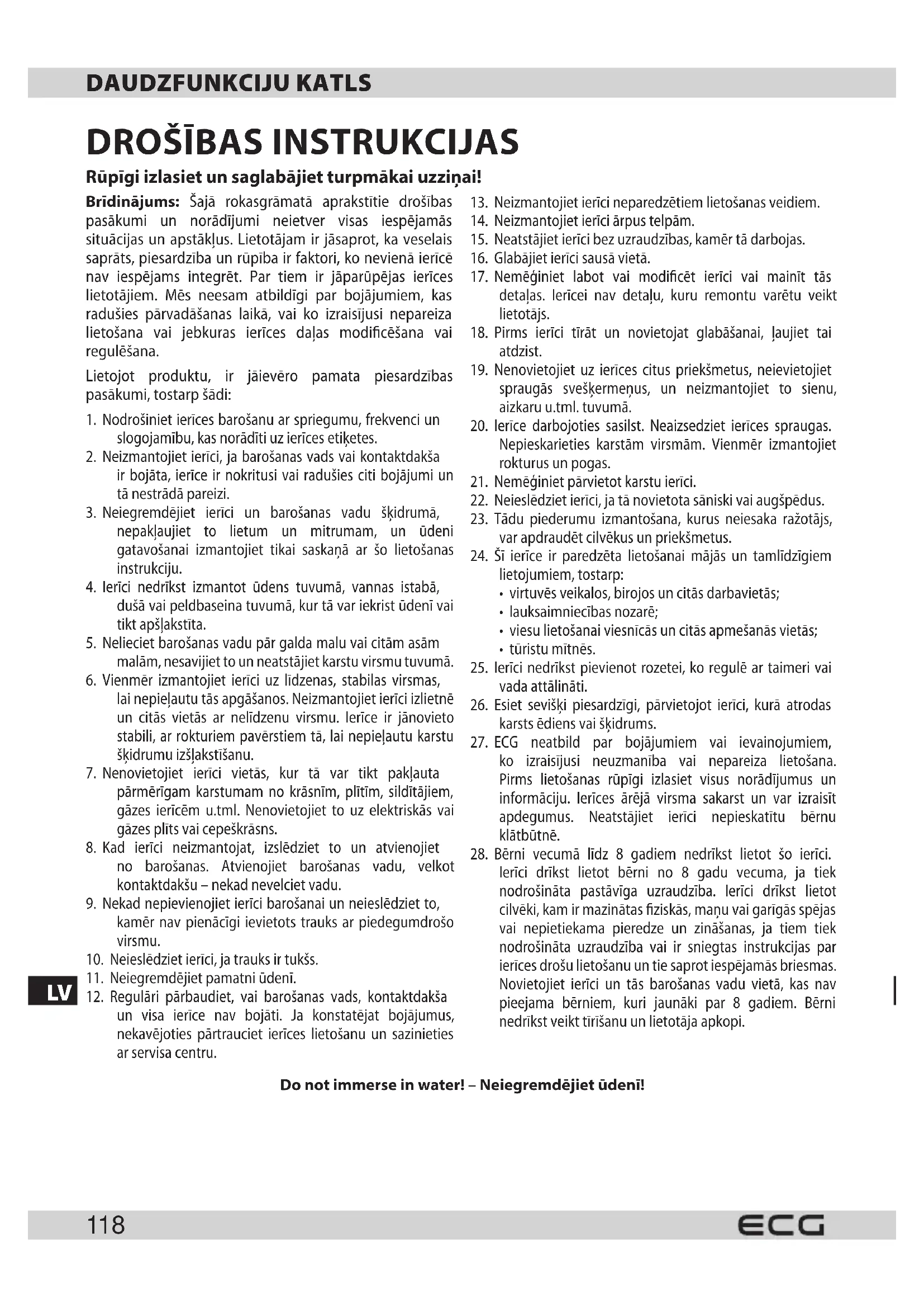 Ierīci drīkst lietot bērni no 8 gadu vecuma, ja tiek nodrošināta pastāvīga uzraudzība. Ierīci drīkst lietot cilvēki, kam ir mazinātas fiziskās, maņu vai garīgās spējas vai nepietiekama pieredze un zināšanas, ja tiem tiek nodrošināta uzraudzība vai ir sniegtas instrukcijas par ierīces drošu lietošanu un tie saprot iespējamās briesmas. Novietojiet ierīci un tās barošanas vadu vietā, kas nav pieejama bērniem, kuri jaunāki par 8 gadiem. Bērni nedrīkst veikt tīrīšanu un lietotāja apkopi. Do not immerse in water! – Neiegremdējiet ūdenī!LV