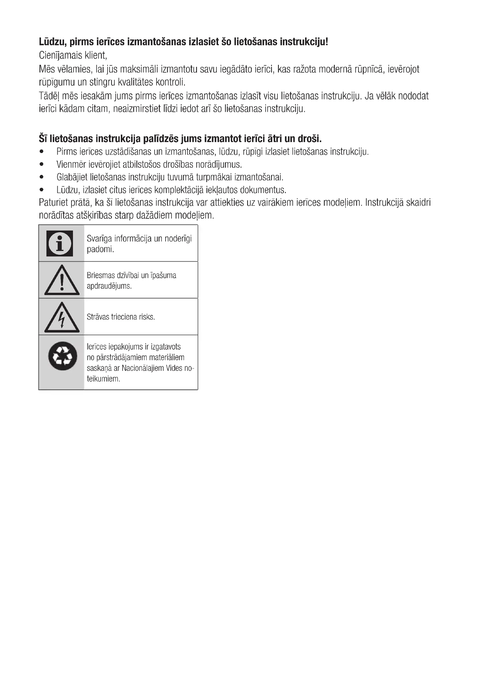 ĮSPĖJIMAS: Jei problema išlieka ir peržiūrėjus šio skyriaus nuorodas, kreipkitės į pardavėją ar įgaliotąjį aptarnavimo centrą. Nebandykite taisyti prietaiso patys.Lūdzu, pirms ierīces izmantošanas izlasiet šo lietošanas instrukciju! Cienījamais klient, Mēs vēlamies, lai jūs maksimāli izmantotu savu iegādāto ierīci, kas ražota modernā rūpnīcā, ievērojot rūpīgumu un stingru kvalitātes kontroli. Tādēļ mēs iesakām jums pirms ierīces izmantošanas izlasīt visu lietošanas instrukciju. Ja vēlāk nododat ierīci kādam citam, neaizmirstiet līdzi iedot arī šo lietošanas instrukciju. Šī lietošanas instrukcija palīdzēs jums izmantot ierīci ātri un droši.