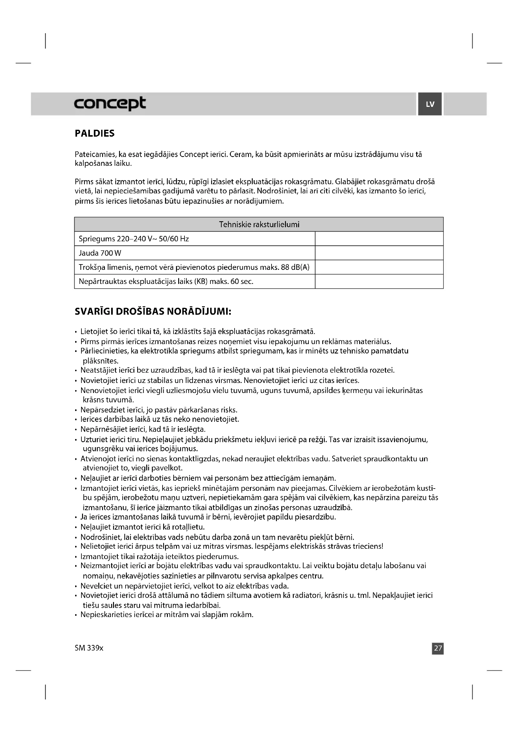 PALDIES Pateicamies, ka esat iegādājies Concept ierīci. Ceram, ka būsit apmierināts ar mūsu izstrādājumu visu tā kalpošanas laiku. Pirms sākat izmantot ierīci, lūdzu, rūpīgi izlasiet ekspluatācijas rokasgrāmatu. Glabājiet rokasgrāmatu drošā vietā, lai nepieciešamības gadījumā varētu to pārlasīt. Nodrošiniet, lai arī citi cilvēki, kas izmanto šo ierīci, pirms šīs ierīces lietošanas būtu iepazinušies ar norādījumiem. Tehniskie raksturlielumi Spriegums 220–240 V~ 50/60 Hz Jauda 700 W Trokšņa līmenis, ņemot vērā pievienotos piederumus maks. 88 dB(A) Nepārtrauktas ekspluatācijas laiks (KB) maks. 60 sec. SVARĪGI DROŠĪBAS NORĀDĪJUMI: