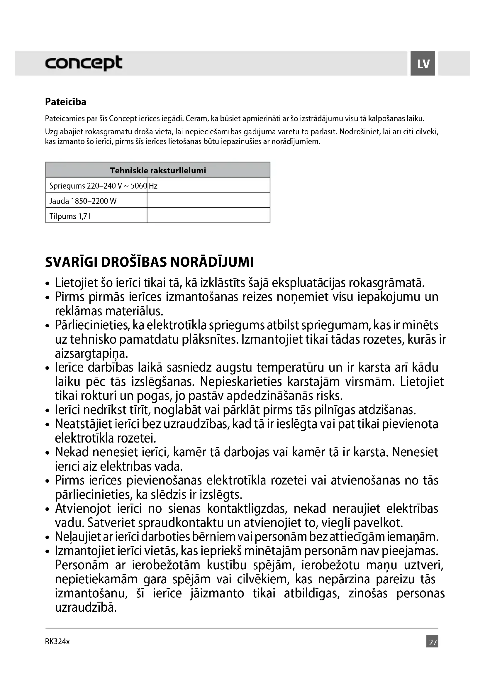 Pateicība Pateicamies par šīs Concept ierīces iegādi. Ceram, ka būsiet apmierināti ar šo izstrādājumu visu tā kalpošanas laiku. Uzglabājiet rokasgrāmatu drošā vietā, lai nepieciešamības gadījumā varētu to pārlasīt. Nodrošiniet, lai arī citi cilvēki, kas izmanto šo ierīci, pirms šīs ierīces lietošanas būtu iepazinušies ar norādījumiem. Tehniskie raksturlielumi Spriegums 220–240 V ~ 5060 Hz Jauda 1850–2200 W Tilpums 1,7 l SVARĪGI DROŠĪBAS NORĀDĪJUMI