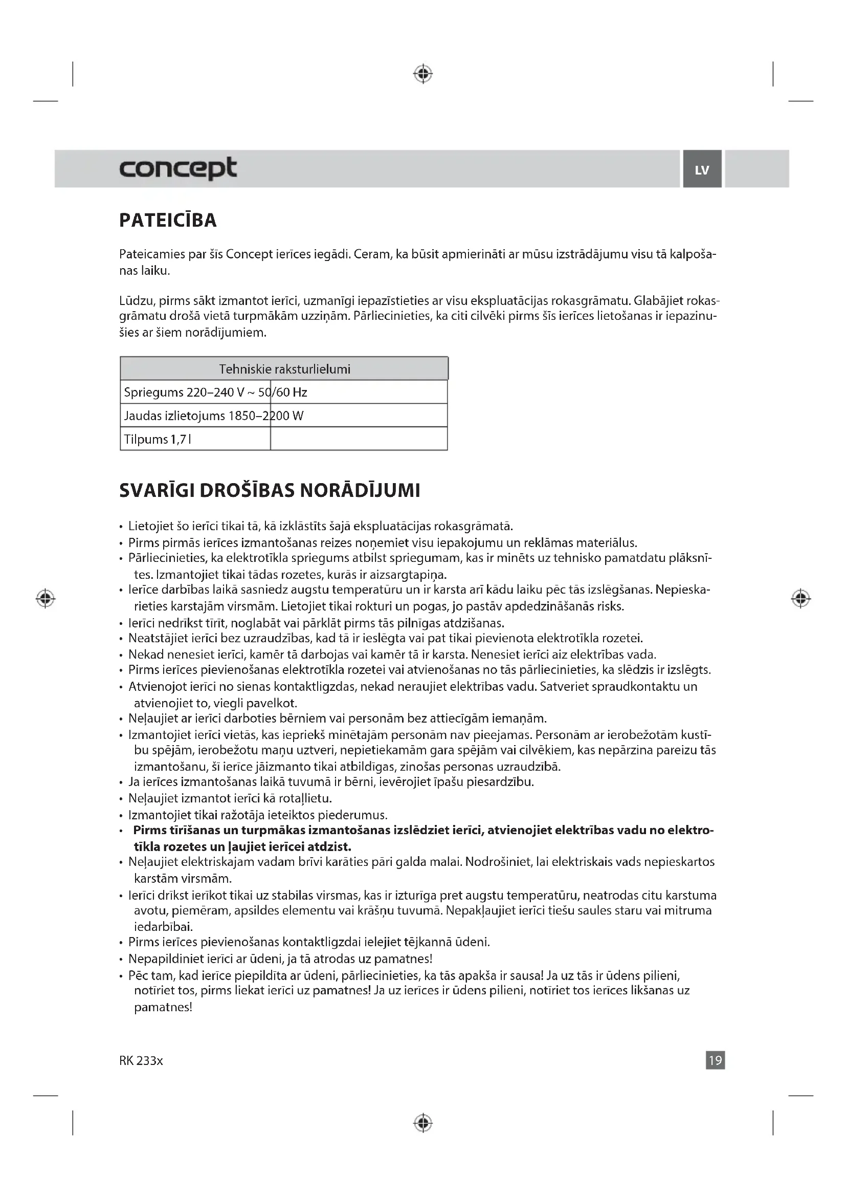 PATEICĪBA Pateicamies par šīs Concept ierīces iegādi. Ceram, ka būsit apmierināti ar mūsu izstrādājumu visu tā kalpoša- nas laiku. Lūdzu, pirms sākt izmantot ierīci, uzmanīgi iepazīstieties ar visu ekspluatācijas rokasgrāmatu. Glabājiet rokas- grāmatu drošā vietā turpmākām uzziņām. Pārliecinieties, ka citi cilvēki pirms šīs ierīces lietošanas ir iepazinu- šies ar šiem norādījumiem. Tehniskie raksturlielumi Spriegums 220–240 V ~ 50/60 Hz Jaudas izlietojums 1850–2200 W Tilpums 1,7 l SVARĪGI DROŠĪBAS NORĀDĪJUMI