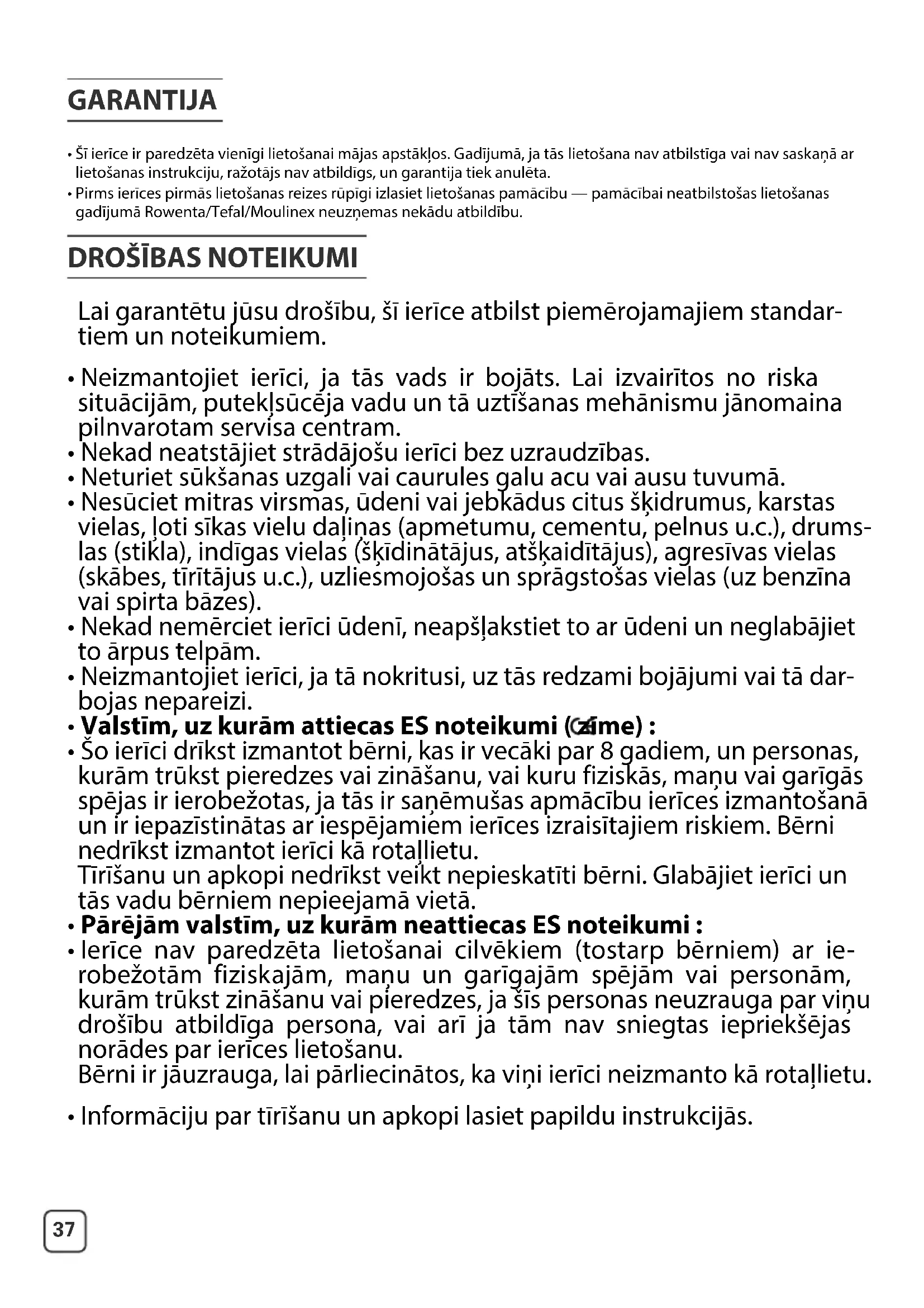 - Pirms ierīces pirmās lietošanas reizes rūpīgi izlasiet lietošanas pamācību — pamācībai neatbilstošas lietošanas gadījumā Rowenta/Tefal/Moulinex neuzņemas nekādu atbildību.