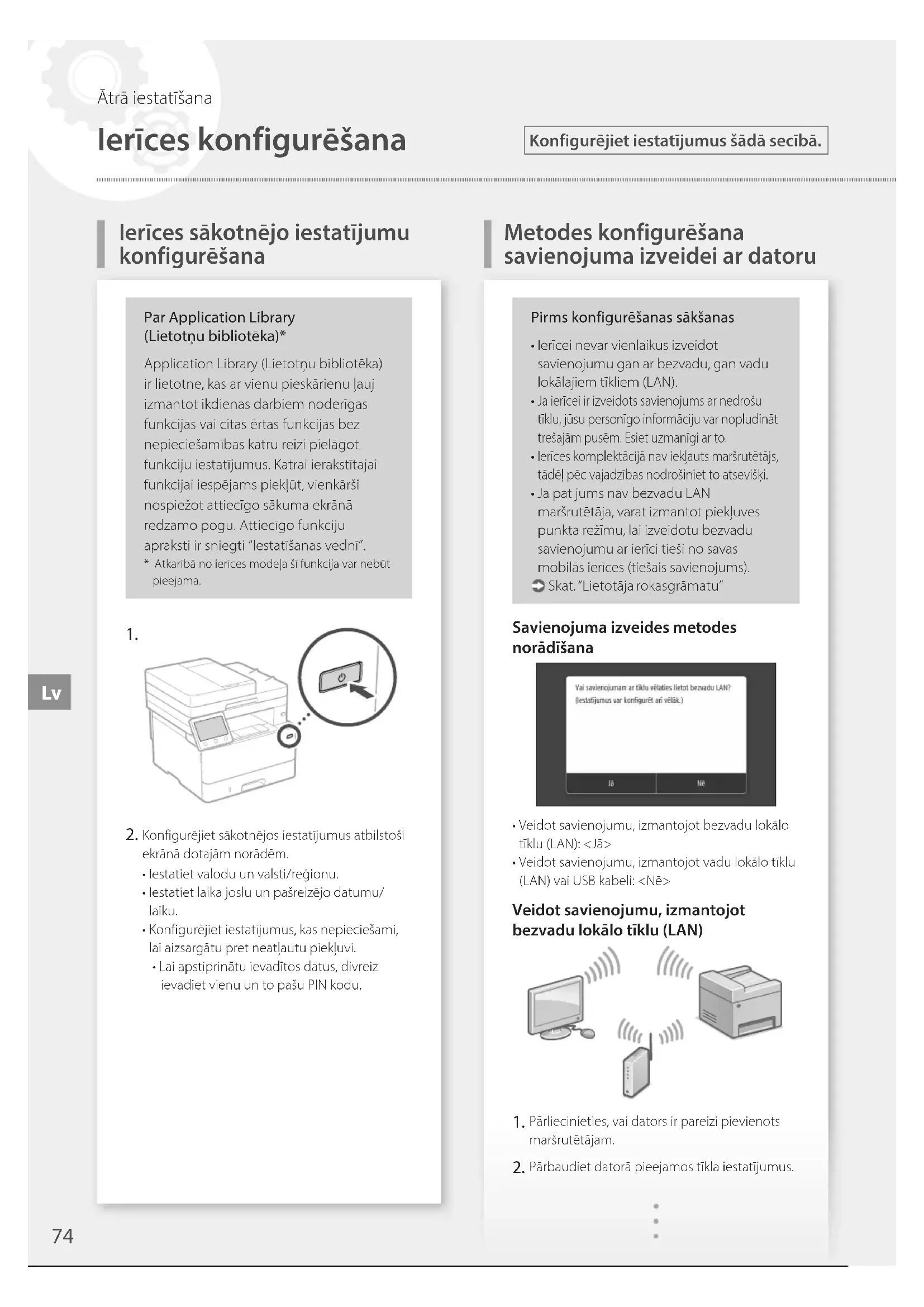 Konfigurējiet sākotnējos iestatījumus atbilstoši ekrānā dotajām norādēm.• Iestatiet valodu un valsti/reģionu.• Iestatiet laika joslu un pašreizējo datumu/laiku.• Konfigurējiet iestatījumus, kas nepieciešami, lai aizsargātu pret neatļautu piekļuvi.• Lai apstiprinātu ievadītos datus, divreiz ievadiet vienu un to pašu PIN kodu.Pirms konfigurēšanas sākšanas• Ierīcei nevar vienlaikus izveidot savienojumu gan ar bezvadu, gan vadu lokālajiem tīkliem (LAN). Ja ierīcei ir izveidots savienojums ar nedrošu tīklu, jūsu personīgo informāciju var nopludināt trešajām pusēm. Esiet uzmanīgi ar to. Ierīces komplektācijā nav iekļauts maršrutētājs, tādēļ pēc vajadzības nodrošiniet to atsevišķi.• Ja pat jums nav bezvadu LAN maršrutētāja, varat izmantot piekļuves punkta režīmu, lai izveidotu bezvadu savienojumu ar ierīci tieši no savas mobilās ierīces (tiešais savienojums). Skat. “Lietotāja rokasgrāmatu”Savienojuma izveides metodes norādīšana• Veidot savienojumu, izmantojot bezvadu lokālo tīklu (LAN): <Jā>• Veidot savienojumu, izmantojot vadu lokālo tīklu (LAN) vai USB kabeli: <Nē>Veidot savienojumu, izmantojot bezvadu lokālo tīklu (LAN) Pārliecinieties, vai dators ir pareizi pievienots maršrutētājam. Pārbaudiet datorā pieejamos tīkla iestatījumus.