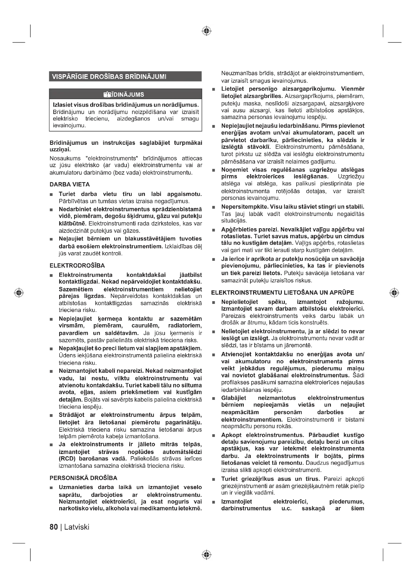 Izlasiet visus drošības brīdinājumus un norādījumus. Brīdinājumu un norādījumu neizpildīšana var izraisīt elektrisko triecienu, aizdegšanos un/vai smagu ievainojumu. Brīdinājumus un instrukcijas saglabājiet turpmākai uzziņai. Nosaukums "elektroinstruments" brīdinājumos attiecas uz jūsu elektrisko (ar vadu) elektroinstrumentu vai ar akumulatoru darbināmo (bez vada) elektroinstrumentu. DARBA VIETA ■ Turiet darba vietu tīru un labi apgaismotu. Pārblīvētas un tumšas vietas izraisa negadījumus. ■ Nedarbiniet elektroinstrumentus sprādzienbīstamā vidē, piemēram, degošu šķidrumu, gāzu vai putekļu klātbūtnē. Elektroinstrumenti rada dzirksteles, kas var aizdedzināt putekļus vai gāzes. ■ Neļaujiet bērniem un blakusstāvētājiem tuvoties darbā esošiem elektroinstrumentiem. Izklaidības dēļ jūs varat zaudēt kontroli. ELEKTRODROŠĪBA ■ Elektroinstrumenta kontaktdakšai jāatbilst kontaktligzdai. Nekad nepārveidojiet kontaktdakšu. Sazemētiem elektroinstrumentiem nelietojiet pārejas ligzdas. Nepārveidotas kontaktdakšas un atbilstošas kontaktligzdas samazinās elektriskā trieciena risku. ■ Nepieļaujiet ķermeņa kontaktu ar sazemētām virsmām, piemēram, caurulēm, radiatoriem, pavardiem un saldētavām. Ja jūsu ķermenis ir sazemēts, pastāv palielināts elektriskā trieciena risks. ■ Nepakļaujiet šo preci lietum vai slapjiem apstākļiem. Ūdens iekļūšana elektroinstrumentā palielina elektriskā trieciena risku. ■ Neizmantojiet kabeli nepareizi. Nekad neizmantojiet vadu, lai nestu, vilktu elektroinstrumentu vai atvienotu kontakdakšu. Turiet kabeli tālu no siltuma avota, eļļas, asiem priekšmetiem vai kustīgām detaļām. Bojāts vai savērpts kabelis palielina elektriskā trieciena iespēju. ■ Strādājot ar elektroinstrumentu ārpus telpām, lietojiet āra lietošanai piemērotu pagarinātāju. Elektriskā trieciena risku samazina lietošanai ārpus telpām piemērota kabeļa izmantošana. ■ Ja elektroinstruments ir jālieto mitrās telpās, izmantojiet strāvas noplūdes automātslēdzi (RCD) barošanas vadā. Paliekošās strāvas ierīces izmantošana samazina elektriskā trieciena risku.
